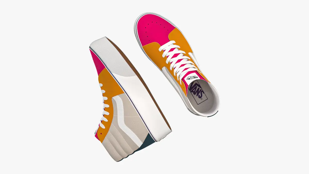 Detailed 3D model of a pair of Vans Sk8-Hi Platform in Multicolour, modeled in Cinema 4D and rendered with V-Ray 5. The model was created using approximate real world dimensions.
