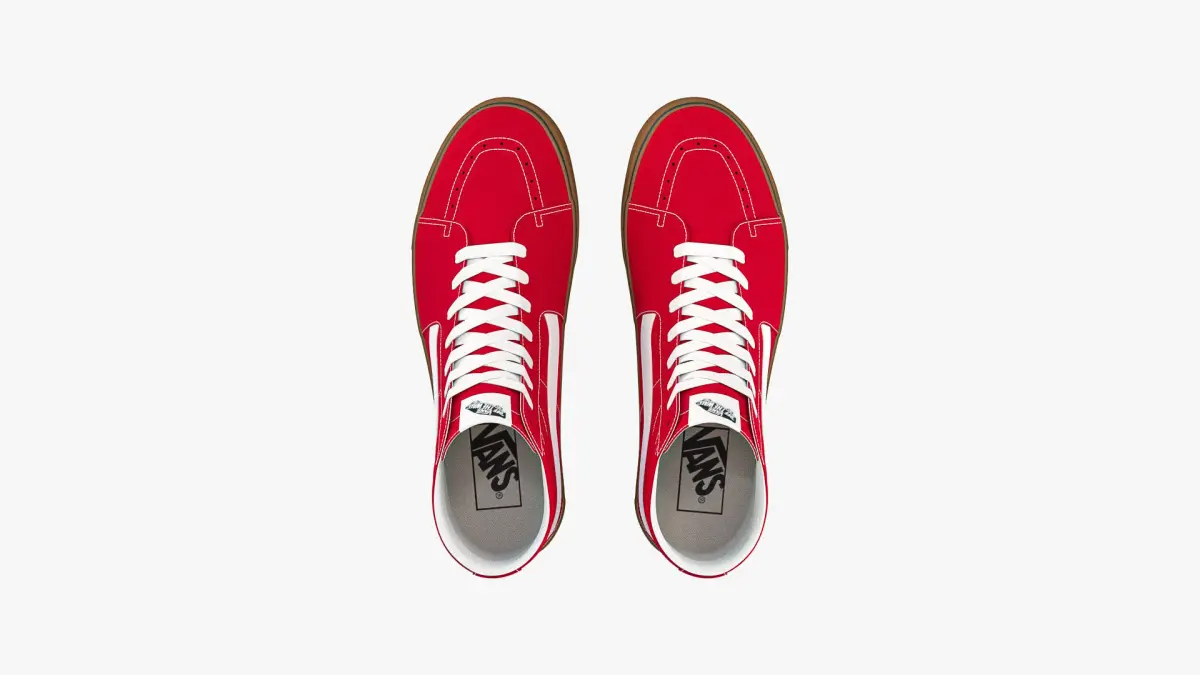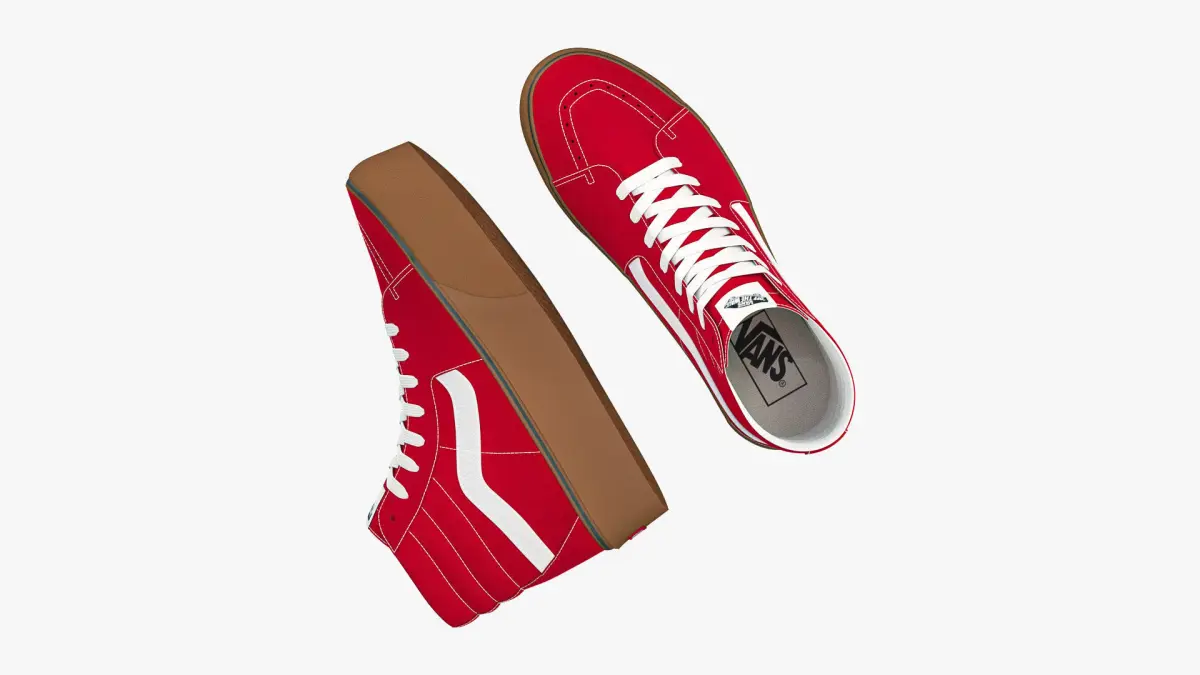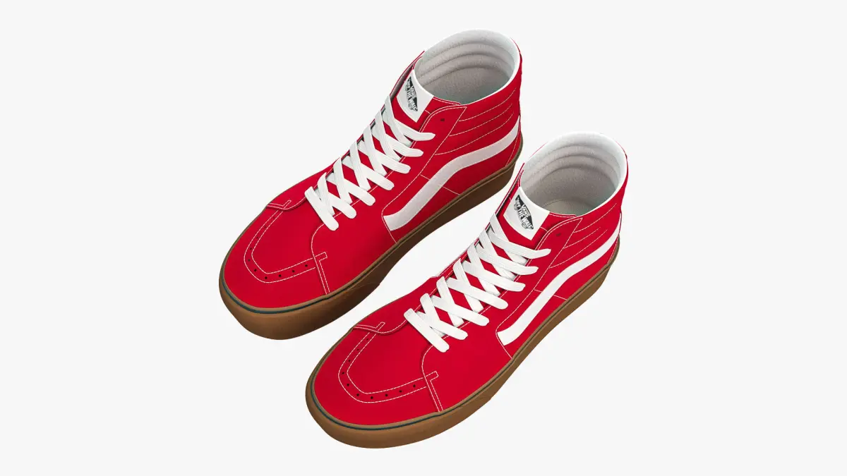 Detailed 3D model of a pair of Vans Sk8-Hi Platform in Red and White with a gumsole, modeled in Cinema 4D and rendered with V-Ray 5. The model was created using approximate real world dimensions.