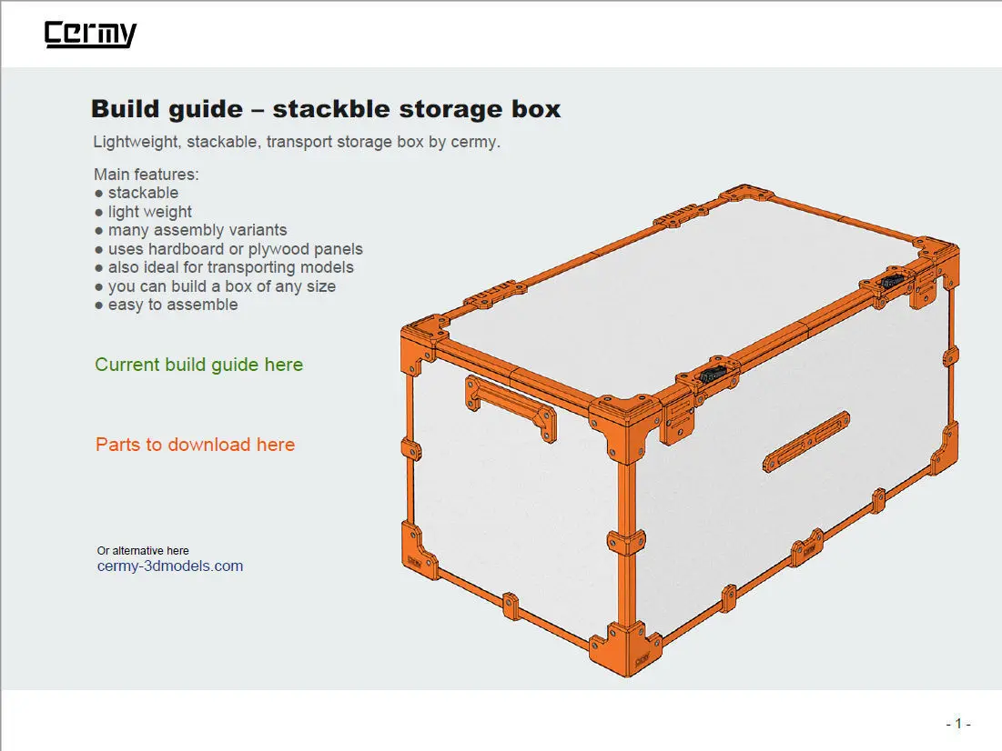 Safely store things you have precious . Your products, RC models or anything you do not store in the purchased box according to your ideas.You can make the size of the box according to your needs .Install parts such as locks, hinges, grip to your exact requirements .Some parts such as hardboard plates, bolts and nuts must be purchased . Printed parts are in .stl format . If you want to see the current version of the assembly instructions, you can find it here :
