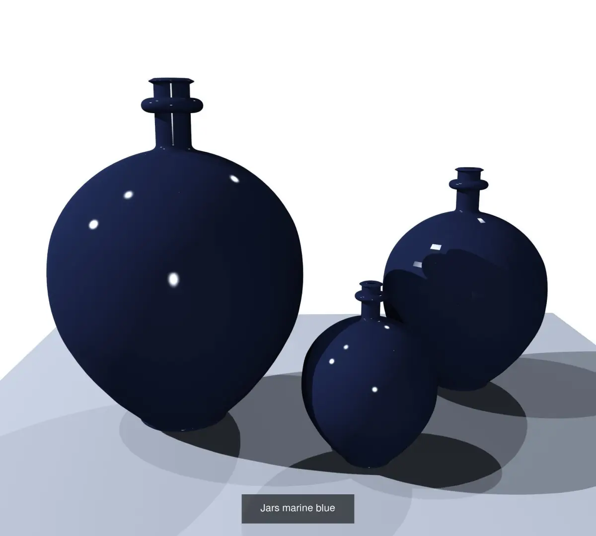 Colection is made of sets. Each set has three jars - the biggest, midle and the small one. They are marineblue glazed that remindes on water, milky glazed that remindes on milk or in different colours. One set has handles with holes and its surface is bump texture processed.