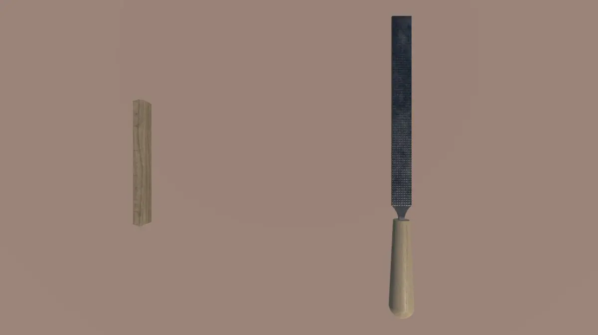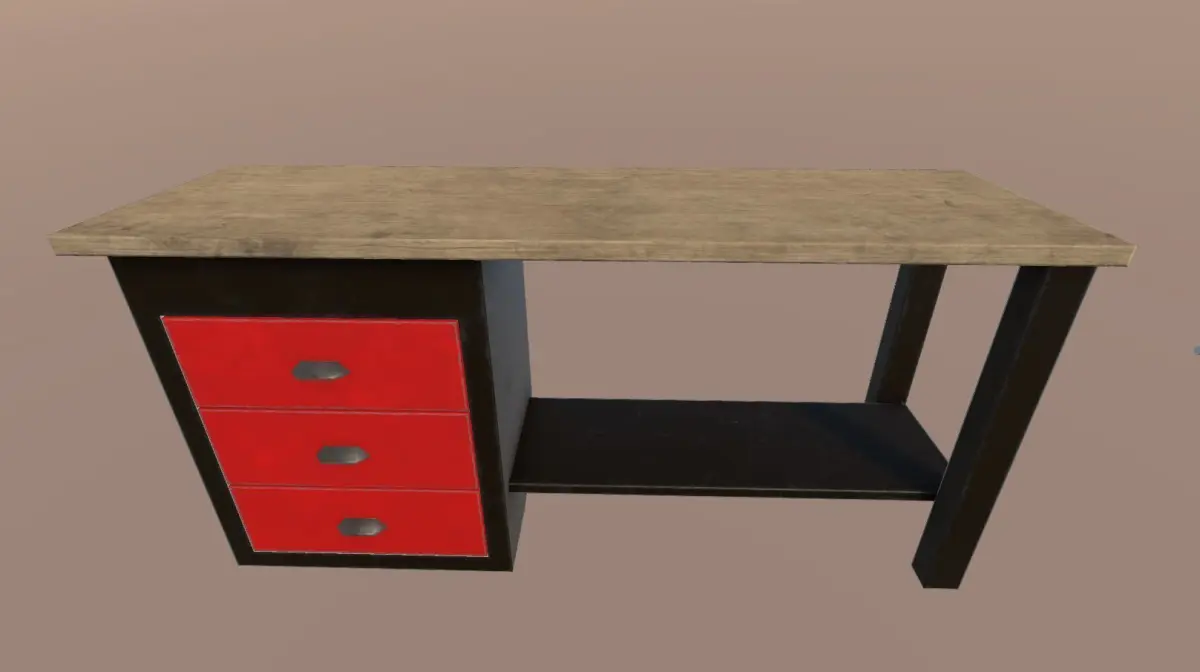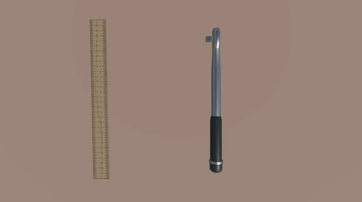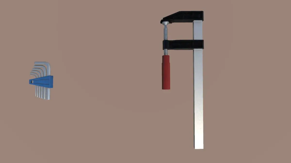 Here is a pack with 19 different low-poly tools and a workbench. The tools are: adjustable wrench, allen key, bolt, cutter, F clamp, floding meter, hacksaw, hammer, lime, nail, pliers, ruler, scissors, screw, screwdriver, short sledgehammer, spirit level, torque wrench and wrench.