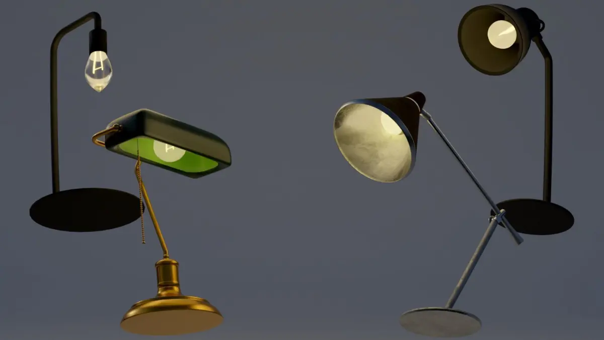 A collection of four desk lamps with high quality mesh and textures. Great for an office scene, yet flexible in it's usage. The lamp styles are Industrial, Modern, Vintage and a Regular lamp. The lamps all have procedural textures that have been converted into image textures and provide the lamps with an added hint of detail, especially upon closer inspection. This means that these assets lend themselves well to closeup scenes.