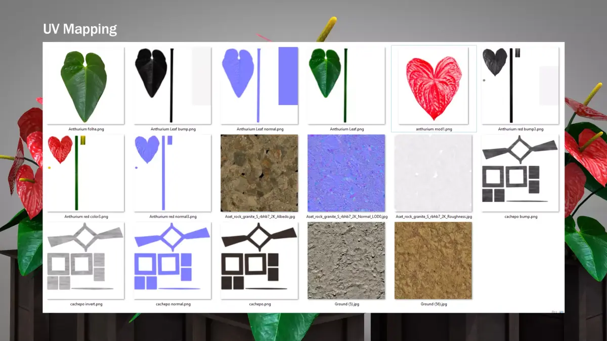 Anturium Plant Vase created in Cinema 4D and exported to 3ds, dae, fbx, obj, and blend files.2k UV texture map. UV mapping with color, bump, and normal maps.In the original Cinema4D model, you can bend the plants using the Bend tool.