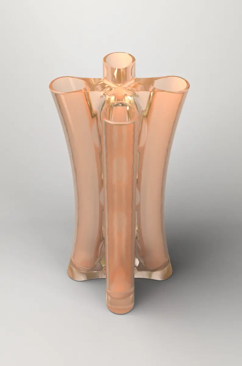 To emphasise the subtlety of a harmonious whole, the vase is primarily made from a transparent resin with a possible hint of several color tones. The design underlines the beauty of fresh flowers and concurrently gives space to the play of light passing through the enchanting structure. The vase is also available in a purely white variant for dry flowers.