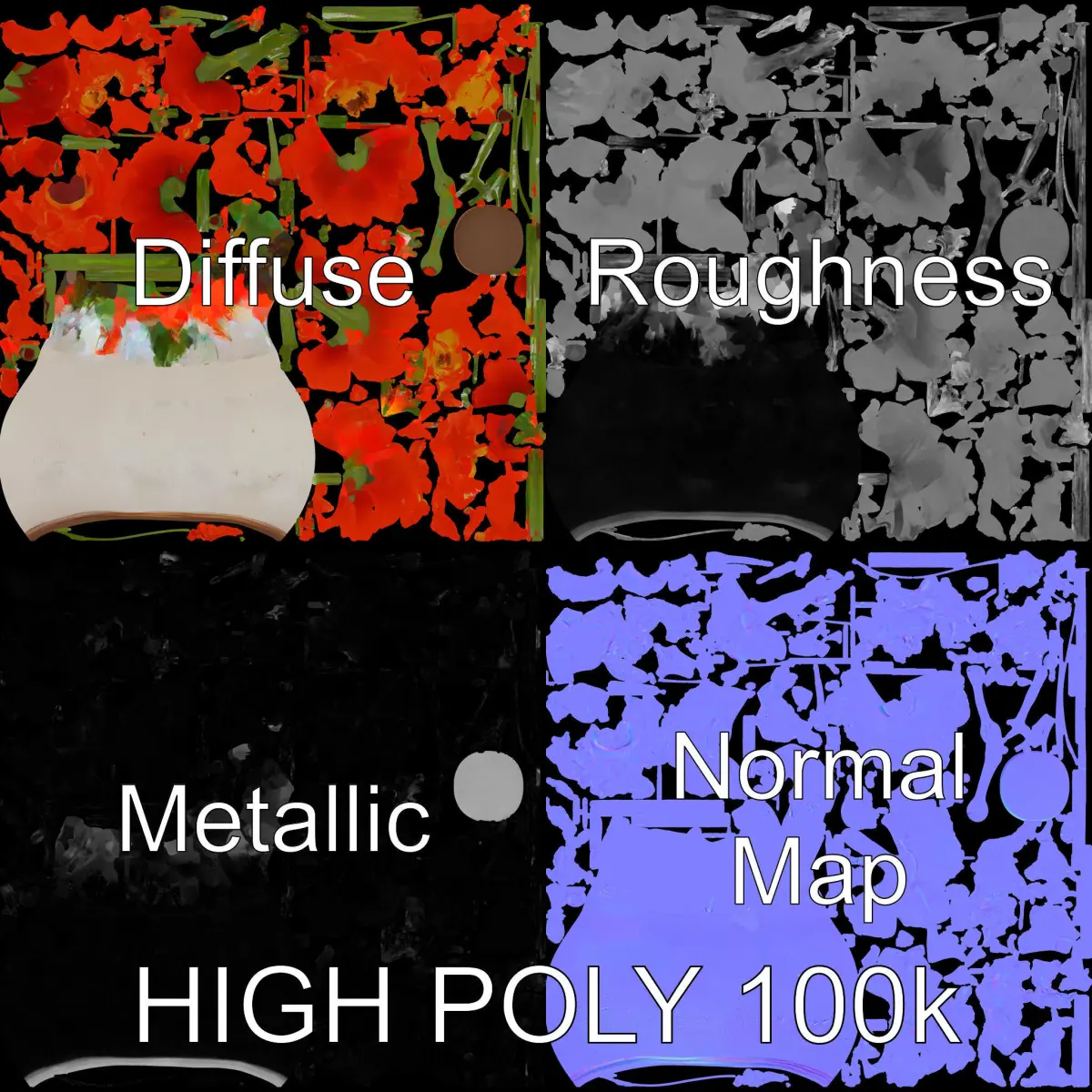 This 3D model pack features a beautifully detailed vase with vibrant poppies, ideal for enhancing interior scenes, floral design visualizations, or as a centerpiece in digital art. Each model is available in three levels of detail: low-poly for mobile apps, mid-poly for environments, and high-poly for production rendering. PBR textures include Diffuse, NormalMap, and reflection/roughness/metallic maps, ensuring realistic material definition across all render engines. All textures are a high resolution of 4096x4096 pixels, providing crisp, clear detail.Perfect for use in 3ds Max, Maya, Cinema 4D, Blender, Unity, and Unreal Engine. The models have been accurately unwrapped with no overlapping UVs, ensuring seamless texturing.The first image is the reference used for creating the 3D model. It is important to carefully evaluate the quality of the model by examining the preview images that display the topology and polygonal mesh. These previews (WIRE and WEB 3D Preview) clearly demonstrate how accurately the model matches the original reference and how well the geometry has been executed.Use this model in interior design, virtual staging, or artistic renderings to bring a touch of nature and elegance to your project. If you like the model, please leave a comment and a like!