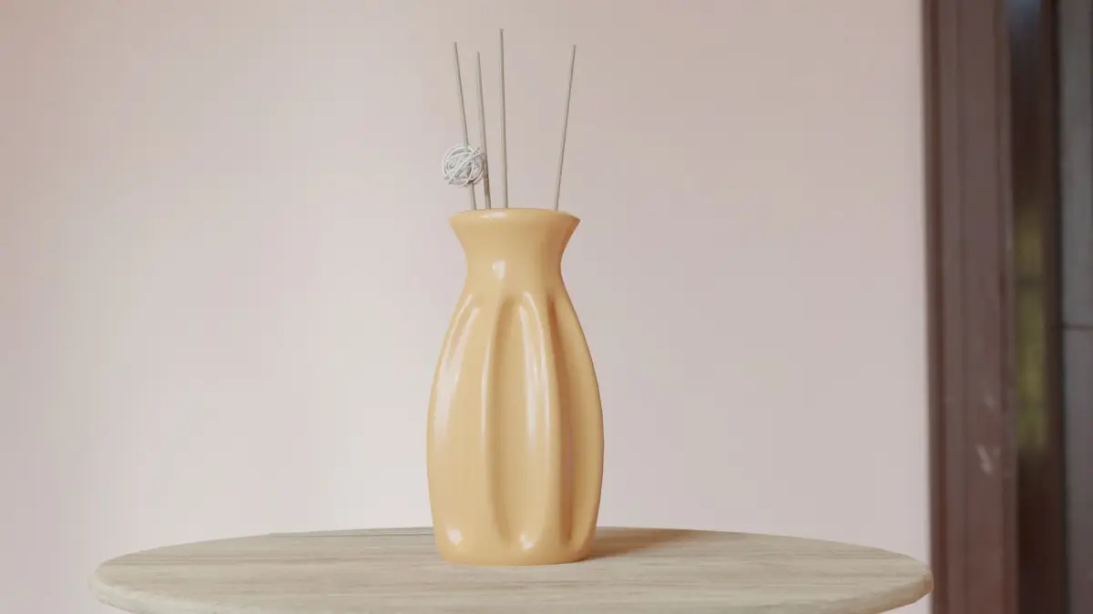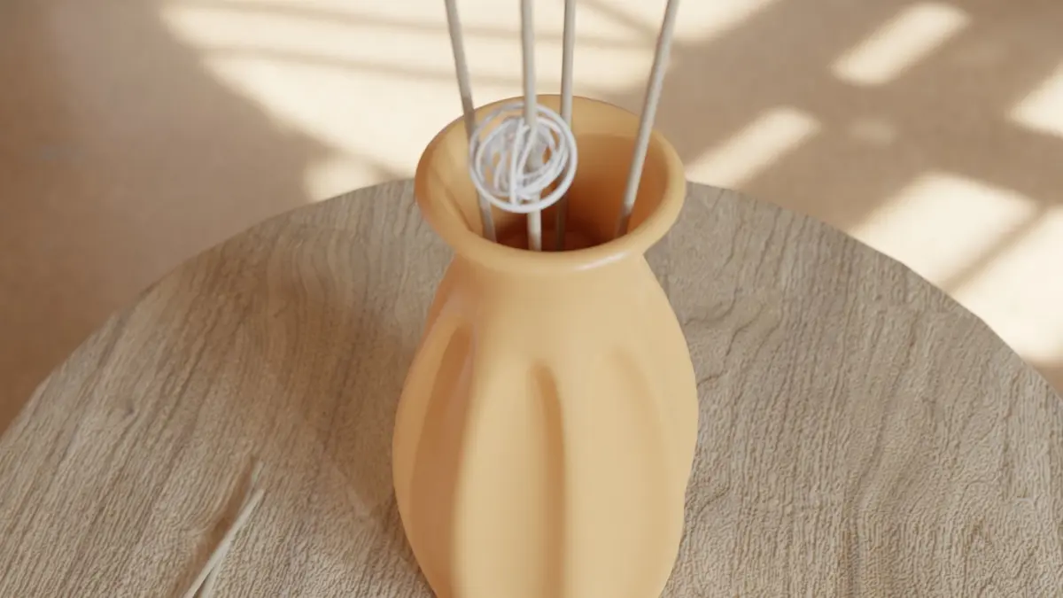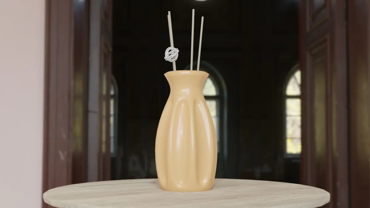 A simple 3D model of a vase. I modeled it with blender. There are 4 sticks in the vase. There is a ball of string attached to the sticks. 37,248 vertices. 74,272 edges. 37,038 faces. 74,468 triangles. 12 objects.