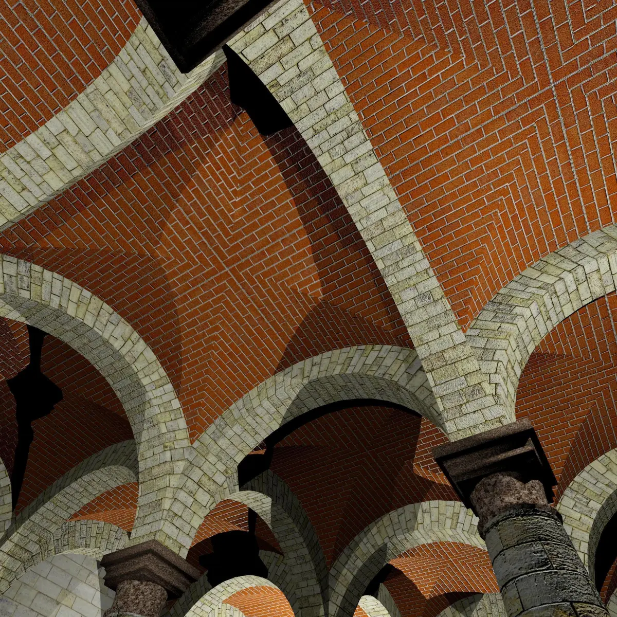 It is part of a Collection based on 5.0m and 7.5m modules (see Vaults Collection on this Site).We propose two different column spacings to avoid or reduce texture distorsion when an image showing squared elements (bricks or stones) is used; nevertheless every scaling operation is feasible to adapt vaults to every need.