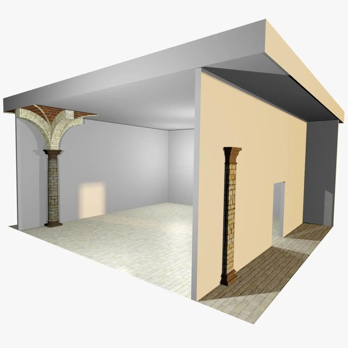 It is part of a Collection based on 5.0m and 7.5m modules (see Vaults Collection on this Site).We propose two different column spacings to avoid or reduce texture distorsion when an image showing squared elements (bricks or stones) is used; nevertheless every scaling operation is feasible to adapt vaults to every need.