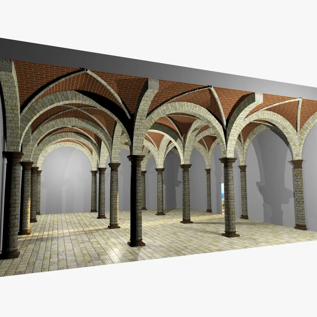 It is part of a Collection based on 5.0m and 7.5m modules (see Vaults Collection on this Site).We propose two different column spacings to avoid or reduce texture distorsion when an image showing squared elements (bricks or stones) is used; nevertheless every scaling operation is feasible to adapt vaults to every need.