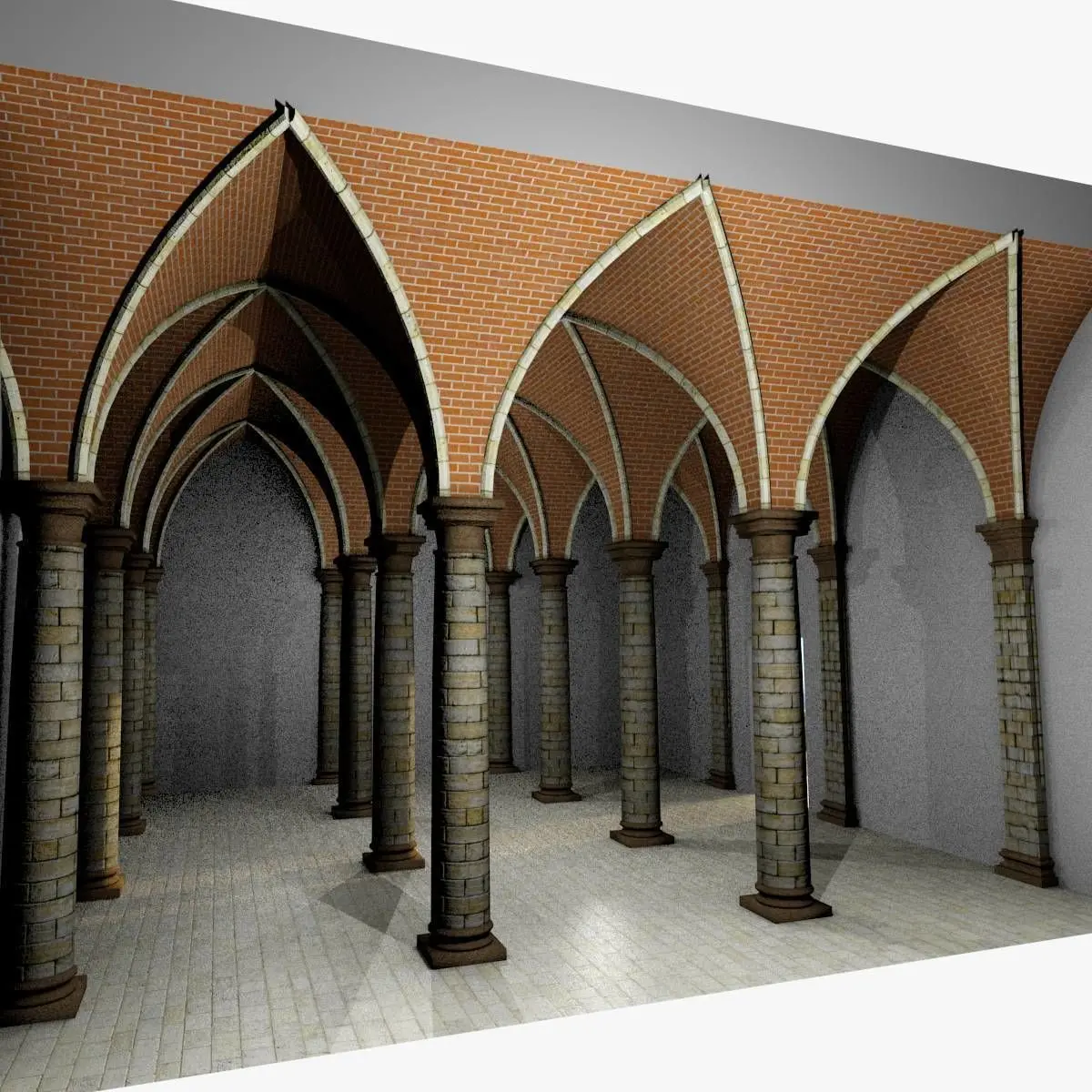 It is part of a Collection based on 5.0m and 7.5m modules (see Vaults Collection on this Site).We propose two different column spacings to avoid or reduce texture distorsion when an image showing squared elements (bricks or stones) is used; nevertheless every scaling operation is feasible to adapt vaults to every need.