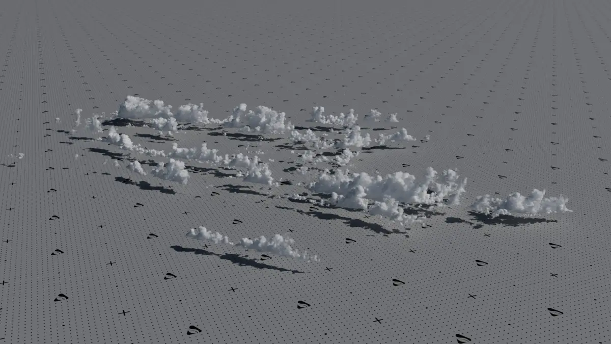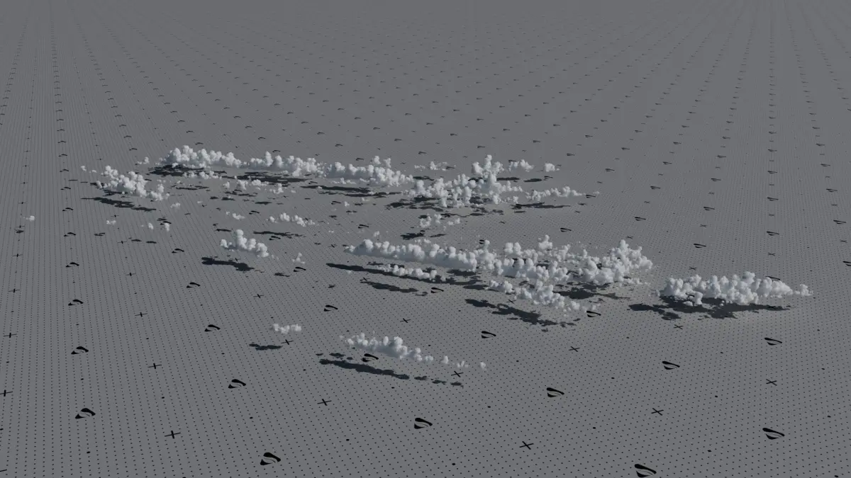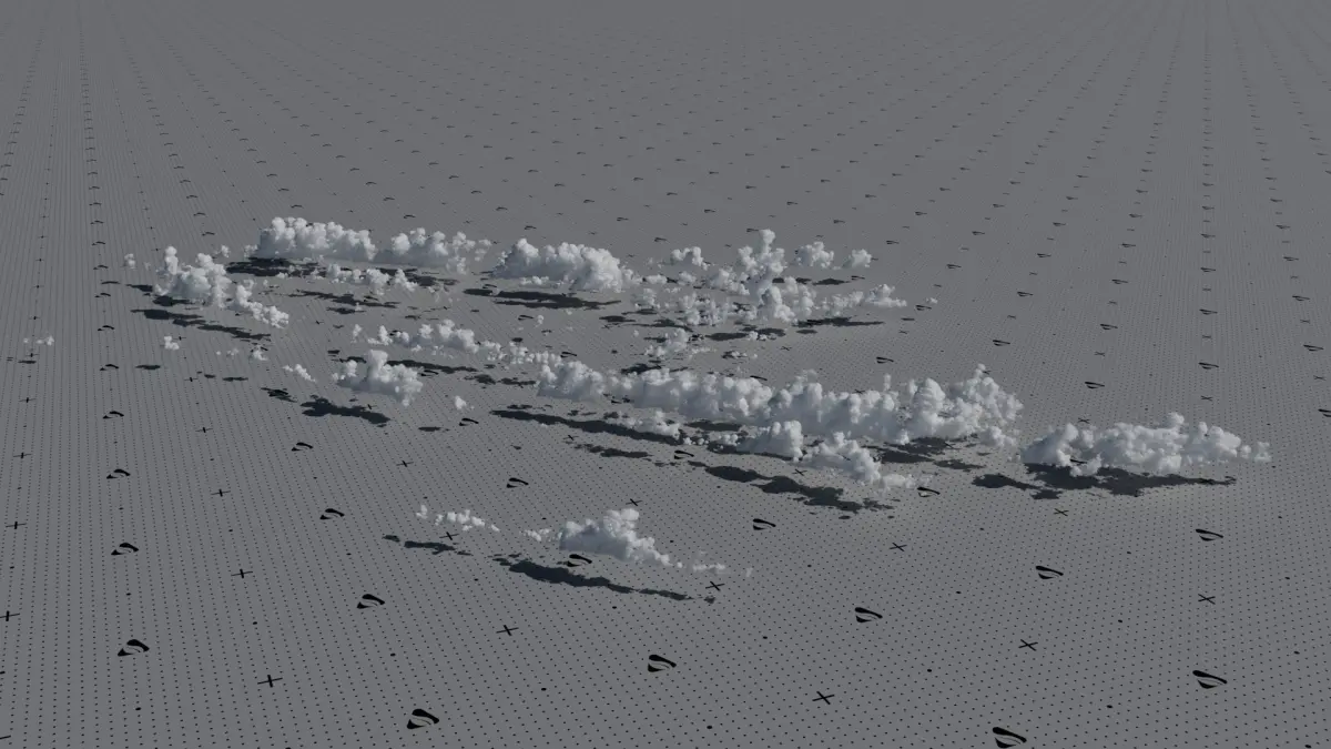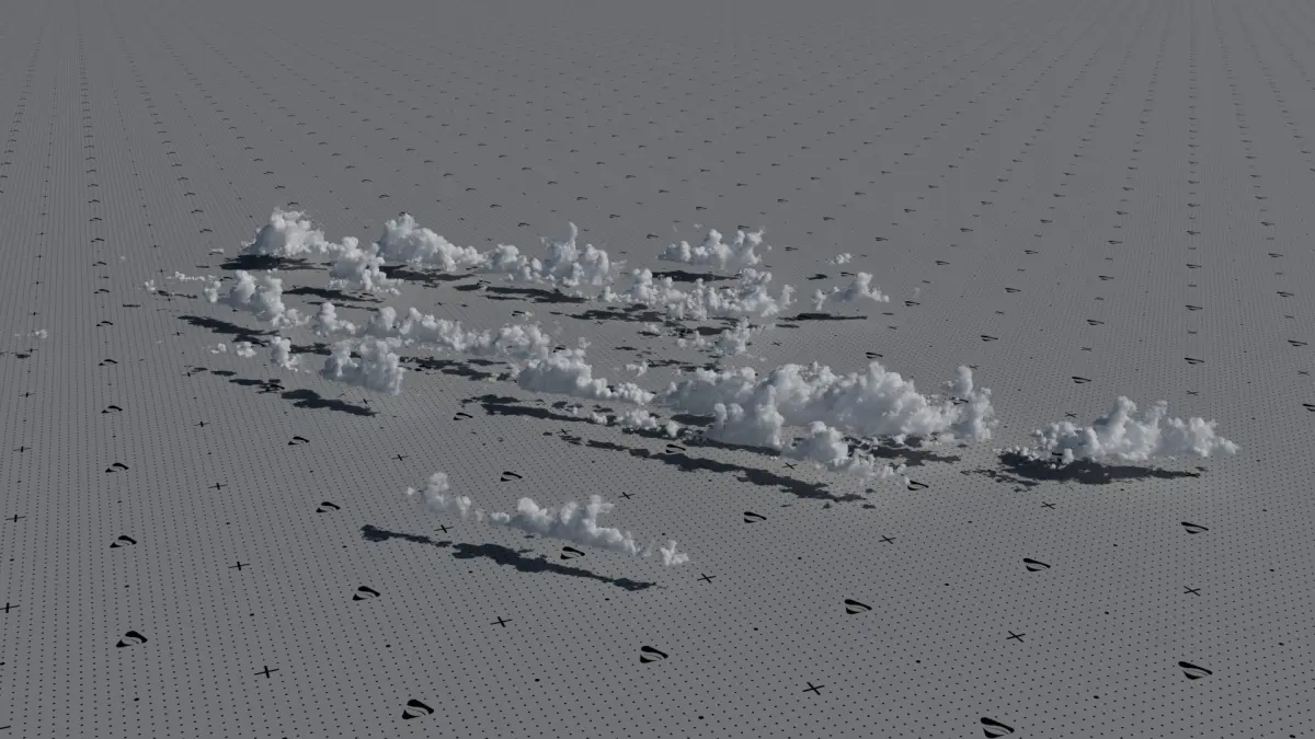 Due to our satellite data-based cloud field simulations, we are able to create much more realistic large-scale, multi-cloud formations, which outperform traditional cloud VDBs in scenes like: