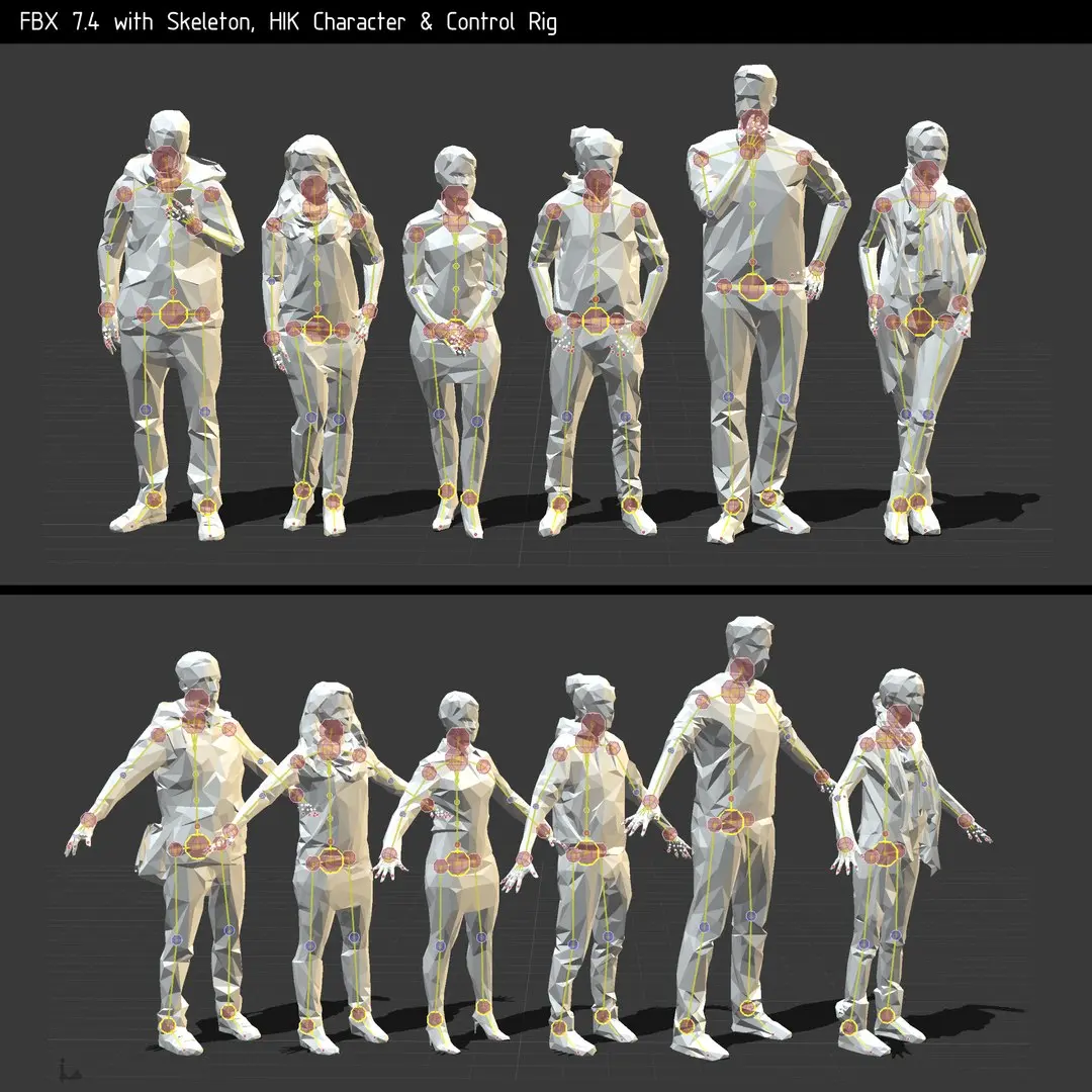 - all figures are fully rigged and contain the original A pose and one casual pose each.