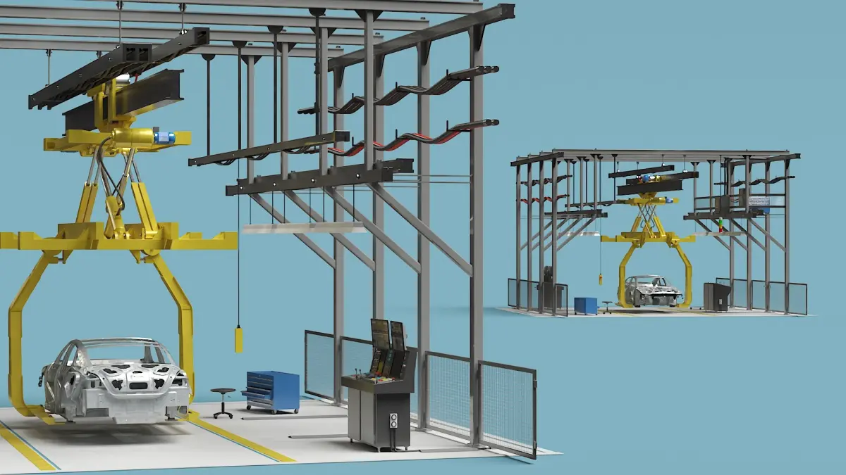 For automotive manufacturing, vehicle assembly, industrial automation, production line systems, material handling, logistics, mechanical engineering, robotics integration, factory equipment layouts, manufacturing process simulations, industrial training modules, and advanced production technology showcases.