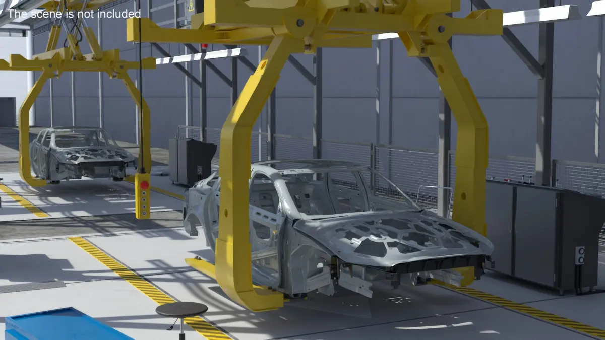 Vehicle Body Carrier is a three-dimensional model of an industrial transport mechanism designed to securely move vehicle bodies within automotive production lines.