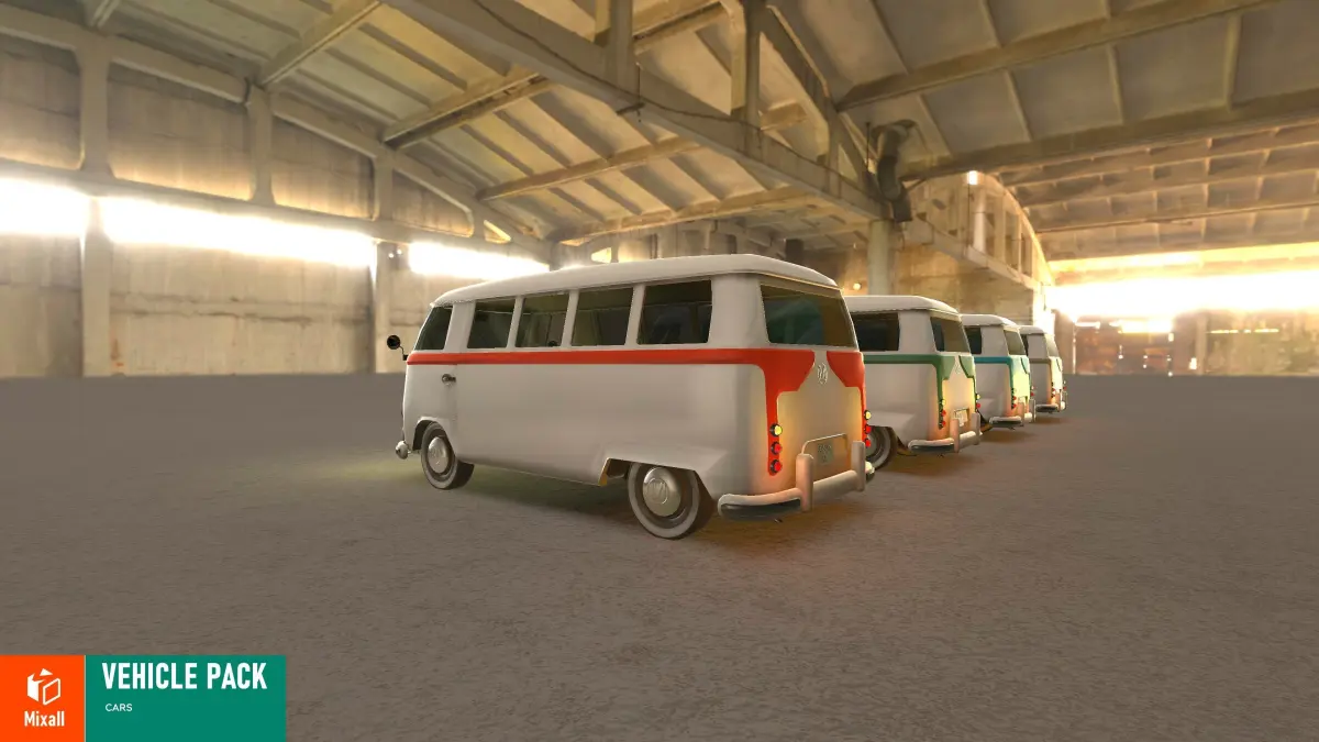 Mixall studio presents a good solution for your games, VR projects and simulators: Vehicle Pack - Cars. Each vehicle has a realistic interior (with a separate steering-wheel), separated wheels (hinged at geometric center), separated calipers and high-res textures.** Key Features **4 unique models vehicle11 different colorsvehicles with separated details optimized for games** Assets **Minivan: Black, Red, Blue.Pickup Truck: Navy blue.Racing Car: Black, Orange, Red.Van: Green, Red, Blue, Beige.