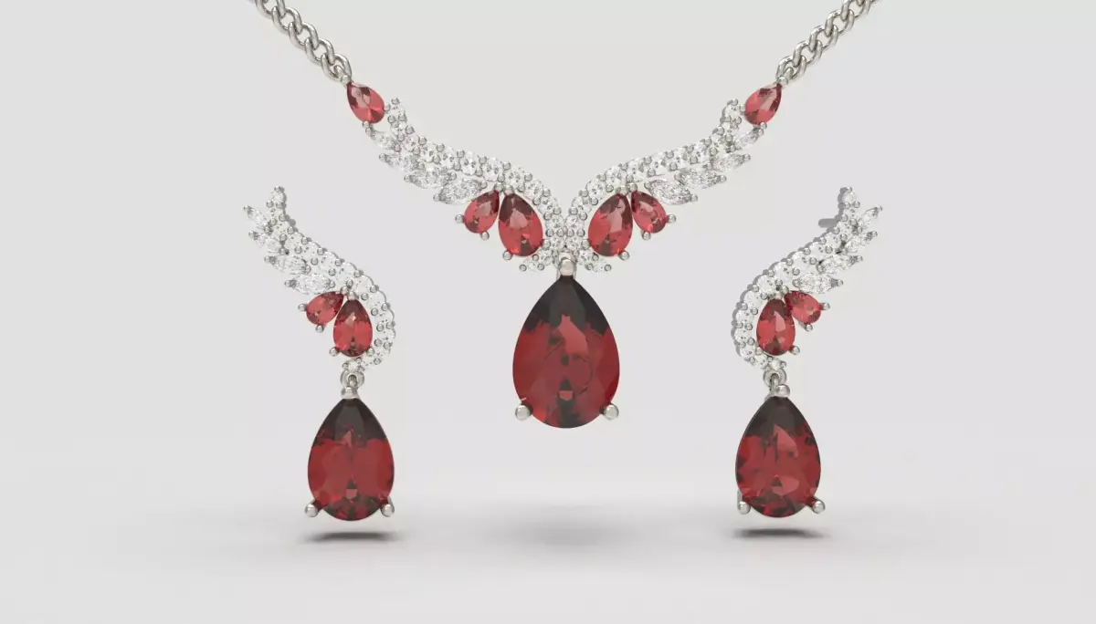 This exquisite pendant-and-earring set celebrates movement and luminous drama.A pear-cut ruby drop anchors an ornate diamond-studded frame, beautifully echoed in the matching earrings for perfect symmetry.Marquise diamonds fan like wings, while pavé round brilliants form a continuous halo that intensifies the ruby’s saturated glow.Openwork filigree and refined prong settings allow light to travel through each facet, producing vibrant scintillation.Sculpted metalwork and elegant proportions balance opulence with wearable grace.Photogenic and couture-ready, this set delivers cinematic color contrast and sparkling texture—ideal for close-up jewelry renders and premium visual showcases that instantly captivate collectors and editorial photographers worldwide.For any edit or revision: +447301387795 or elpouriapaypal@gmail.com