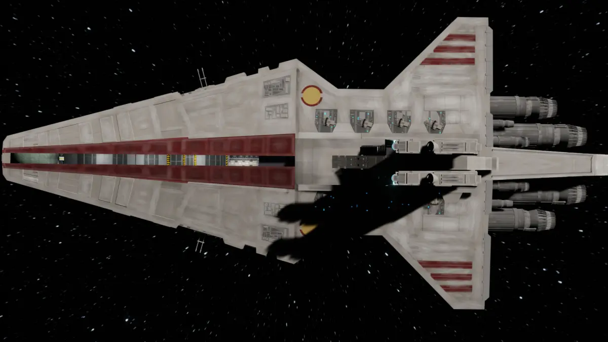 Highly detailed exterior hull with precise textures and markingsCharacteristic red and white livery of the Venator class.Detailed engines with realistic materials.Illuminated bridge section for a realistic representation.Interior (hangar)