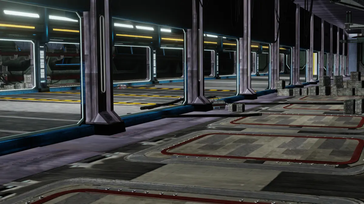 Spacious, illuminated hangar with detailed floor structures.Side rows of windows with reflective materials and lighting.Launch pads and walkways for a realistic environment.High-quality textures and sci-fi design for optimum immersion.Possible applications: