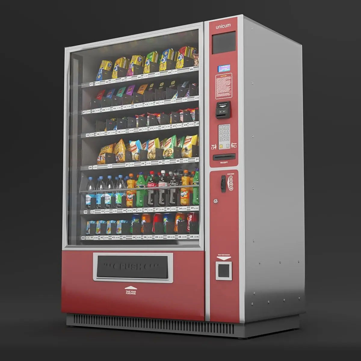 High quality detailed model of vending machine/ You can change color to any other, decals have an alpha channel. Color map is instance for all painted materials.Dimensions (width*height*depth): 1300х1850х900 (mm) 51х73х35 (inches)