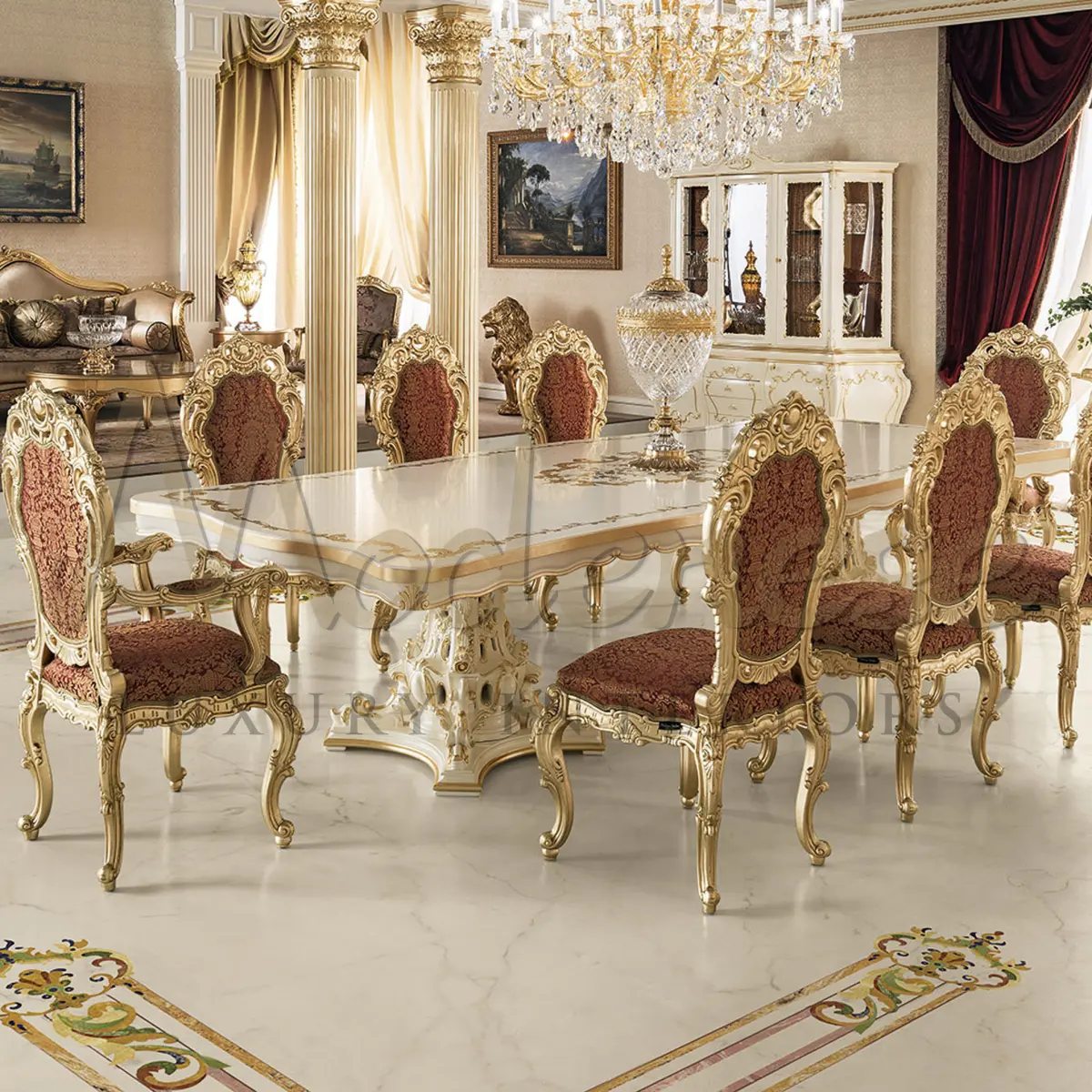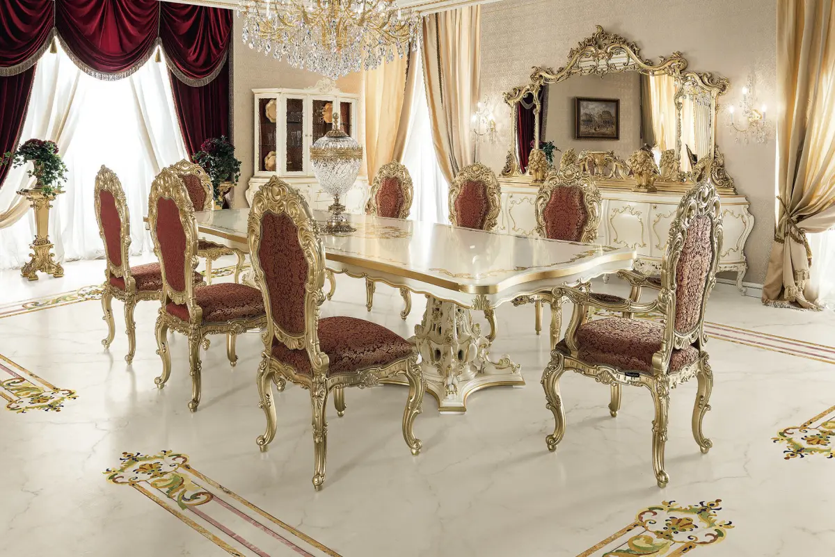 This majestic table set designed for those with a luxurious setting. Glamorous Venetian style dining table made of a solid wood in ivory white, decorated with golden motif all around the rimming and the table's top. The excitement continue down the double pedestals base with an exaggerated embellished . A piece great to elevate the grand dining space.