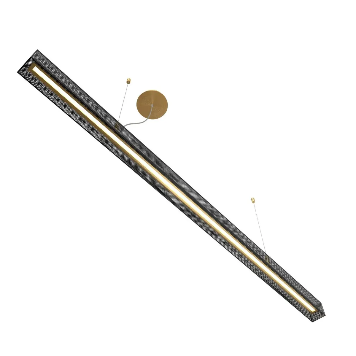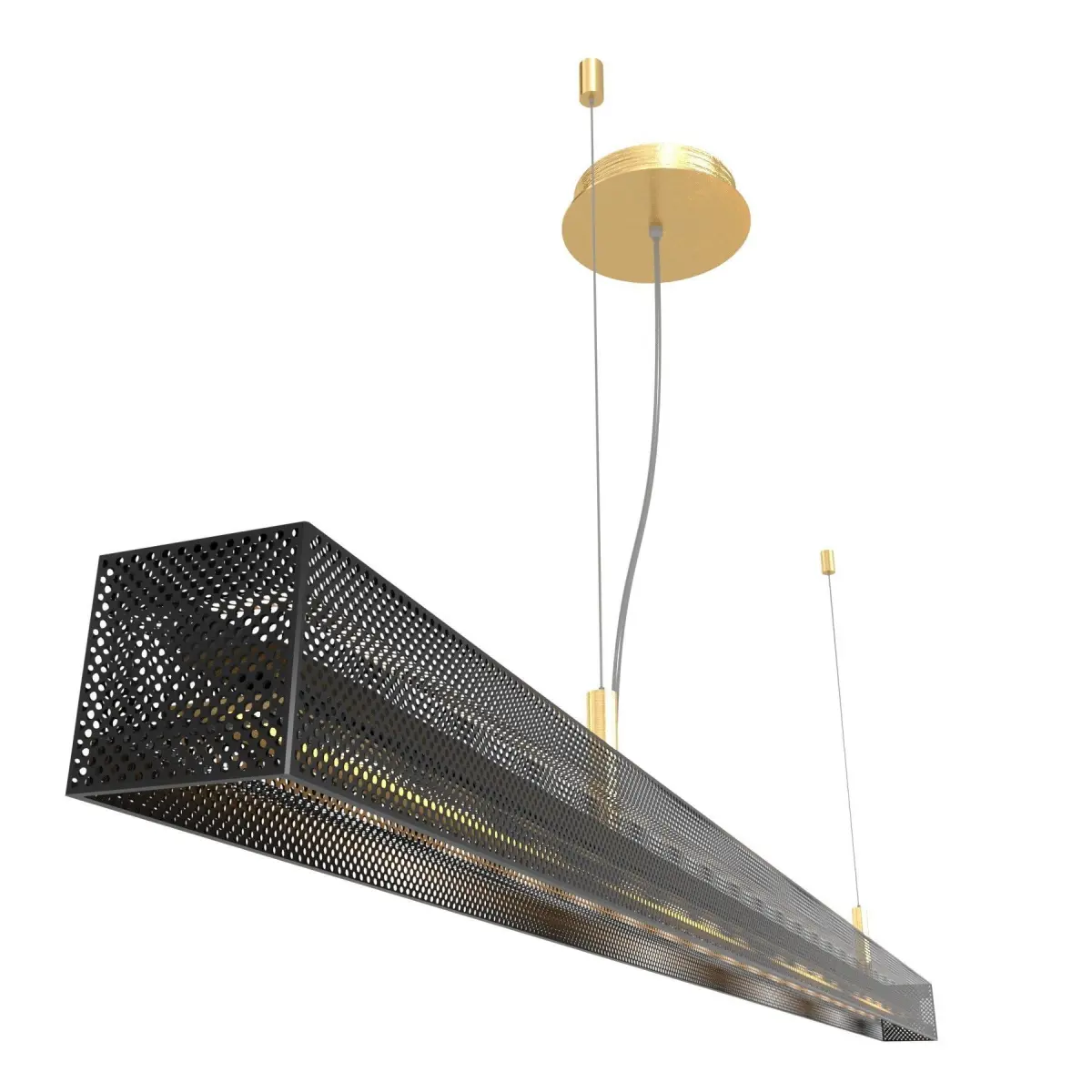 URBAN LIGHTLINE | Pendant lamp By VeniceMCollection UrbanType LED brass pendant lampDesigner Massimo TonettoURBAN LIGHTLINE SUSPENSIONSuspended lamp with direct and indirect light. Metal structure with light burnished brass finish and matte black perforated metal lampshade.1x50W LED 5475lm 2700°K CRI90 – Dimmable 0-10V.black perforated metal finishsize160 x 7 x H.12,5 cm - adjustable in height with steel cables.