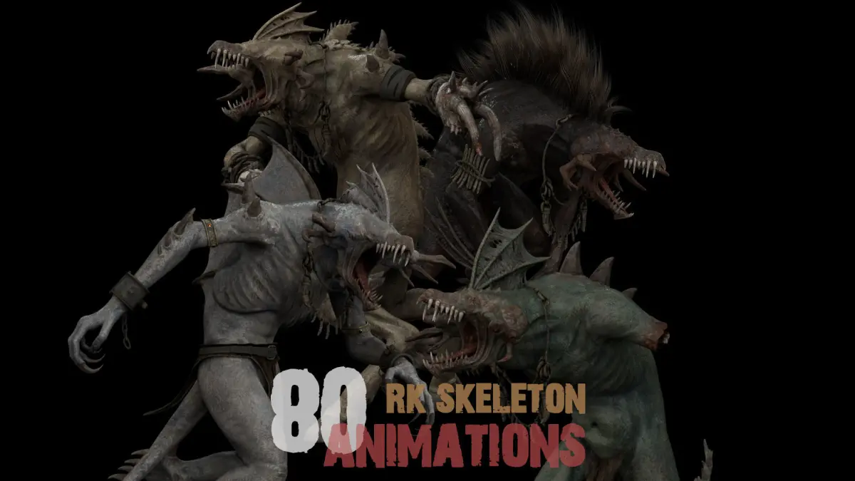 80 Animations(Idle: 6, Walk: 11, Run: 10, Jump: 10, Attack: 15, GetHit: 15, Move: 6, Death: 3, Scream: 4)All RK Skeleton-based animations are interchangeable.
