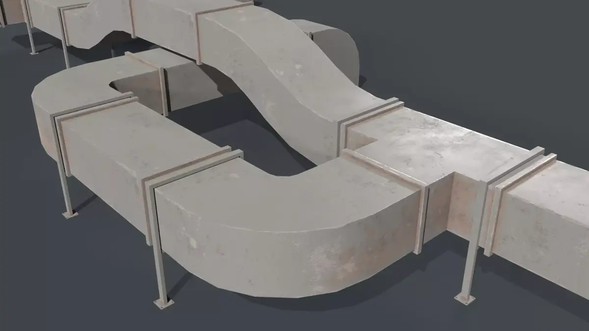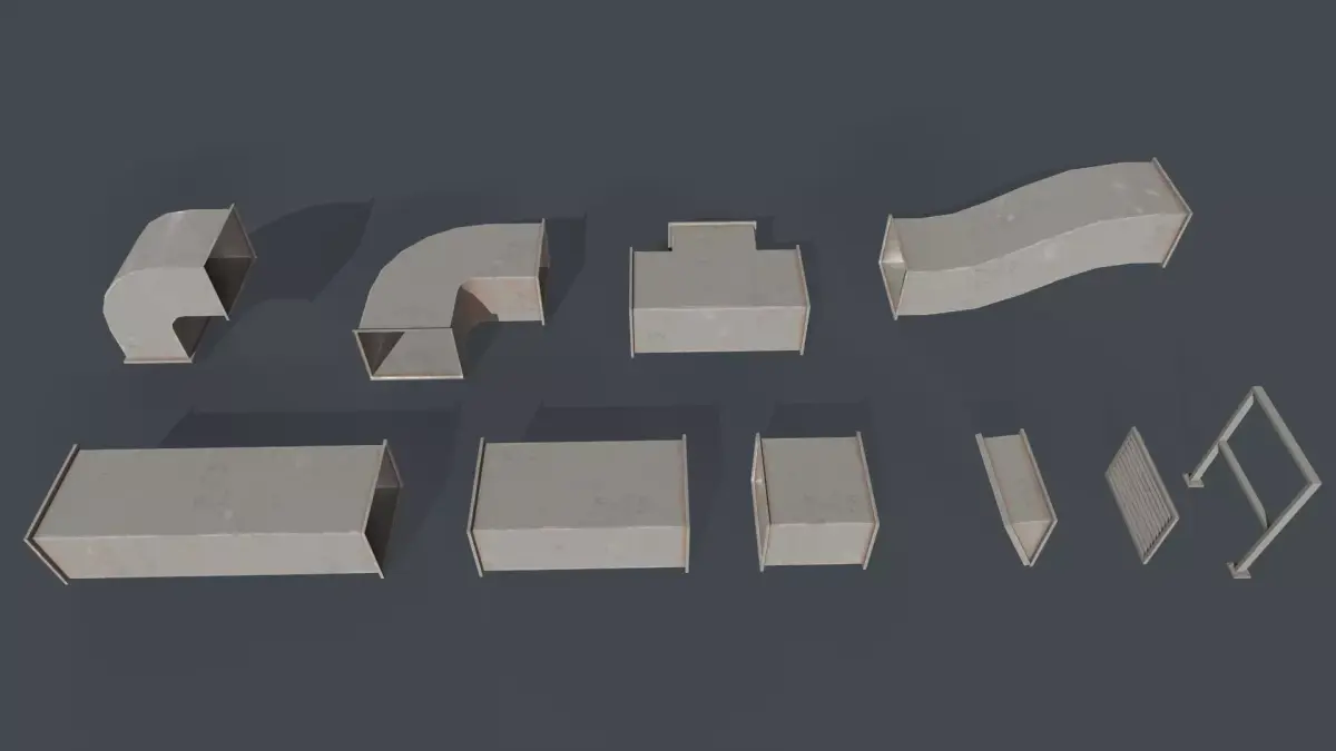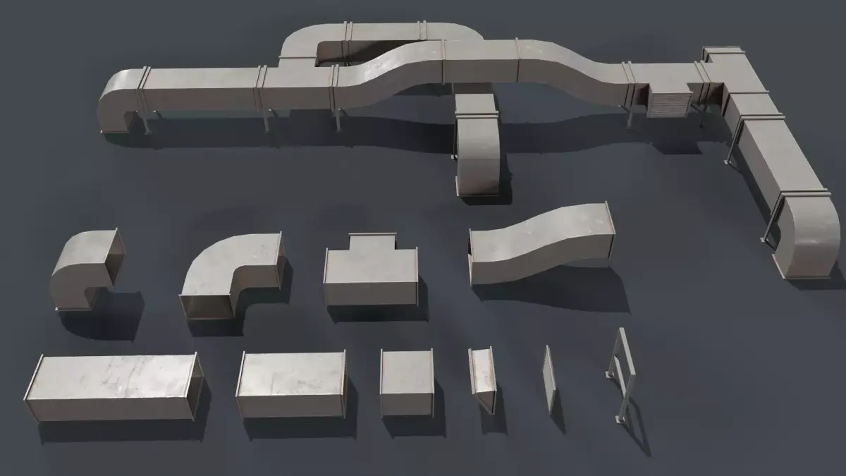 This pack includes 10 detailed 3D roof duct models along with additional modular and connective pieces designed for industrial and architectural environments.