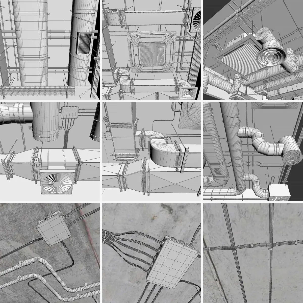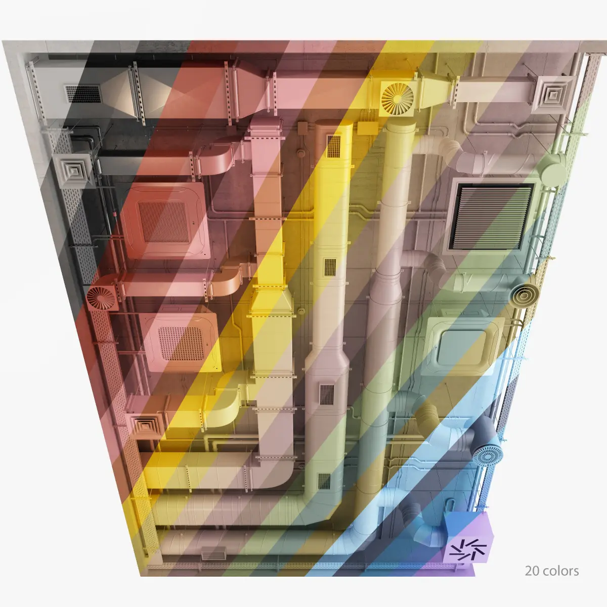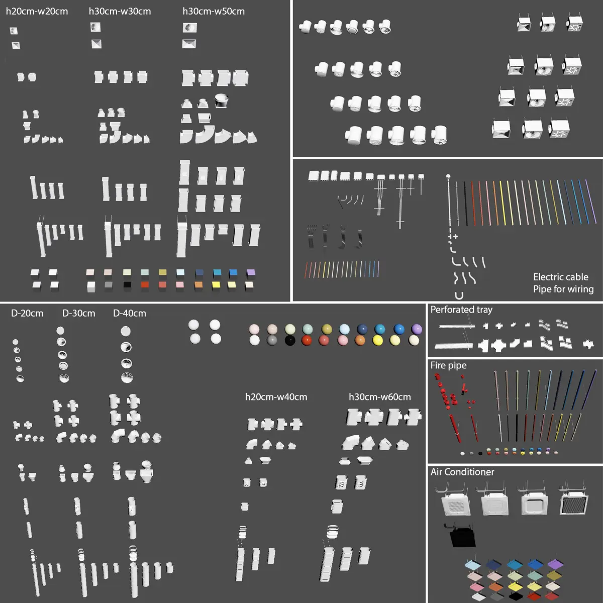 Ventilation system_set 02The set has 20 multi-colored ceilings with ventilation ducts.The model has a fragment of the ceiling as a preview and all the elements in disassembled form. There are more than 500 unique elements in the collection.