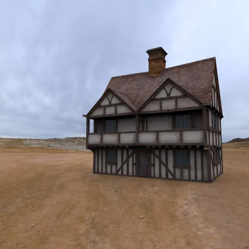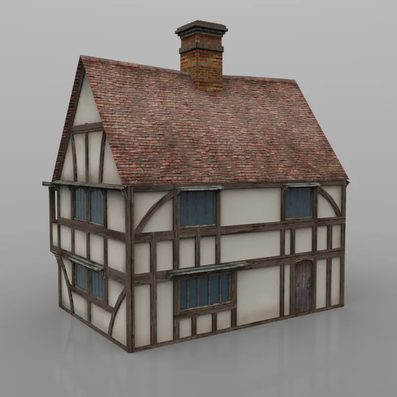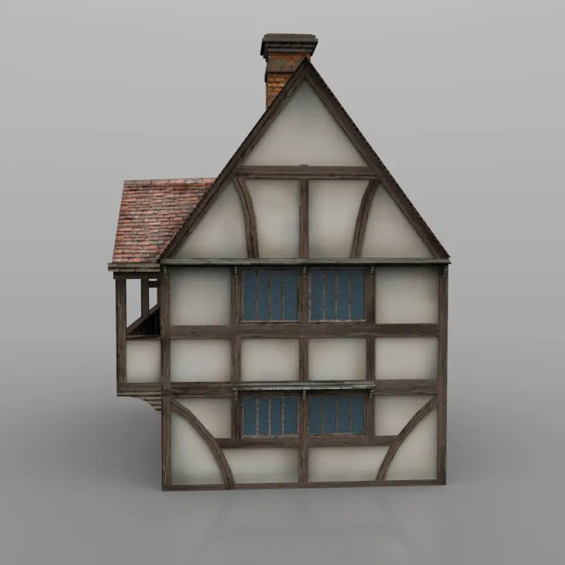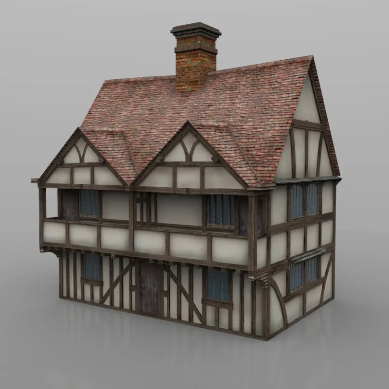 A classic medieval timber framed house with a jettied upper veranda on the front elevation.