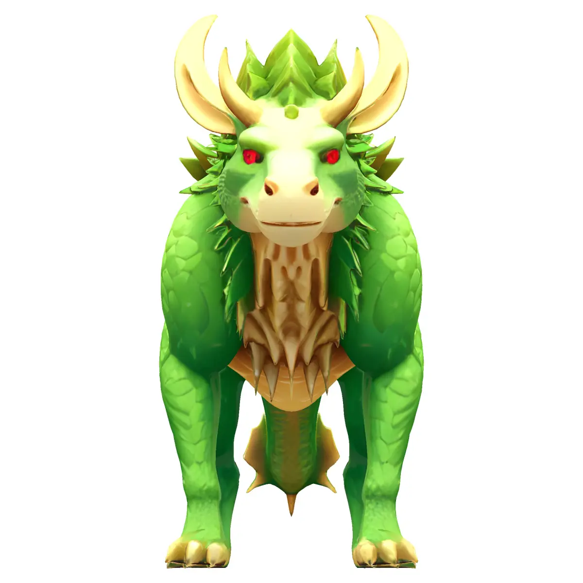 This charming 3D model features a unique dragon design that combines elements of both dragon and deer characteristics. The creature has a distinctive green scaled body with cream-colored accents. Notable features include majestic deer-like antlers in a warm cream color, striking red eyes that add a mystical touch, and an impressive array of spiky scales along its back and neck. The model has been carefully designed with detailed texturing on the scales and a robust, quadrupedal stance that would ensure good 3D printing stability.