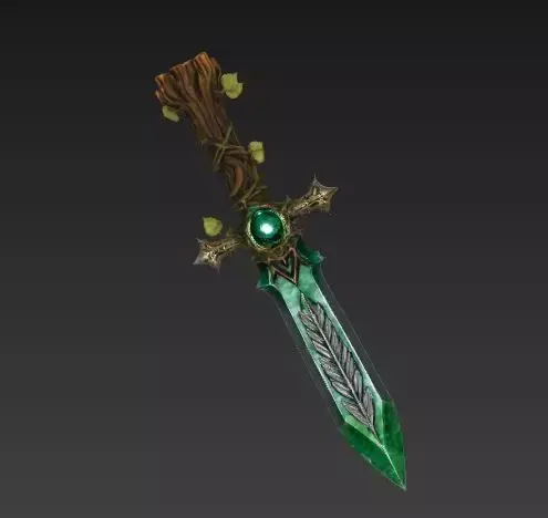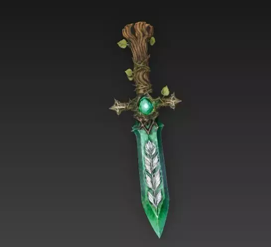 Emerald Jade Blade The blade is crafted from a polished green material, likely jade or magical emerald, rather than steel. It has a beautiful, vibrant green hue that suggests it deals poison or nature damage. Running down the center is a detailed silver inlay in the shape of a fern or leaf branch.
