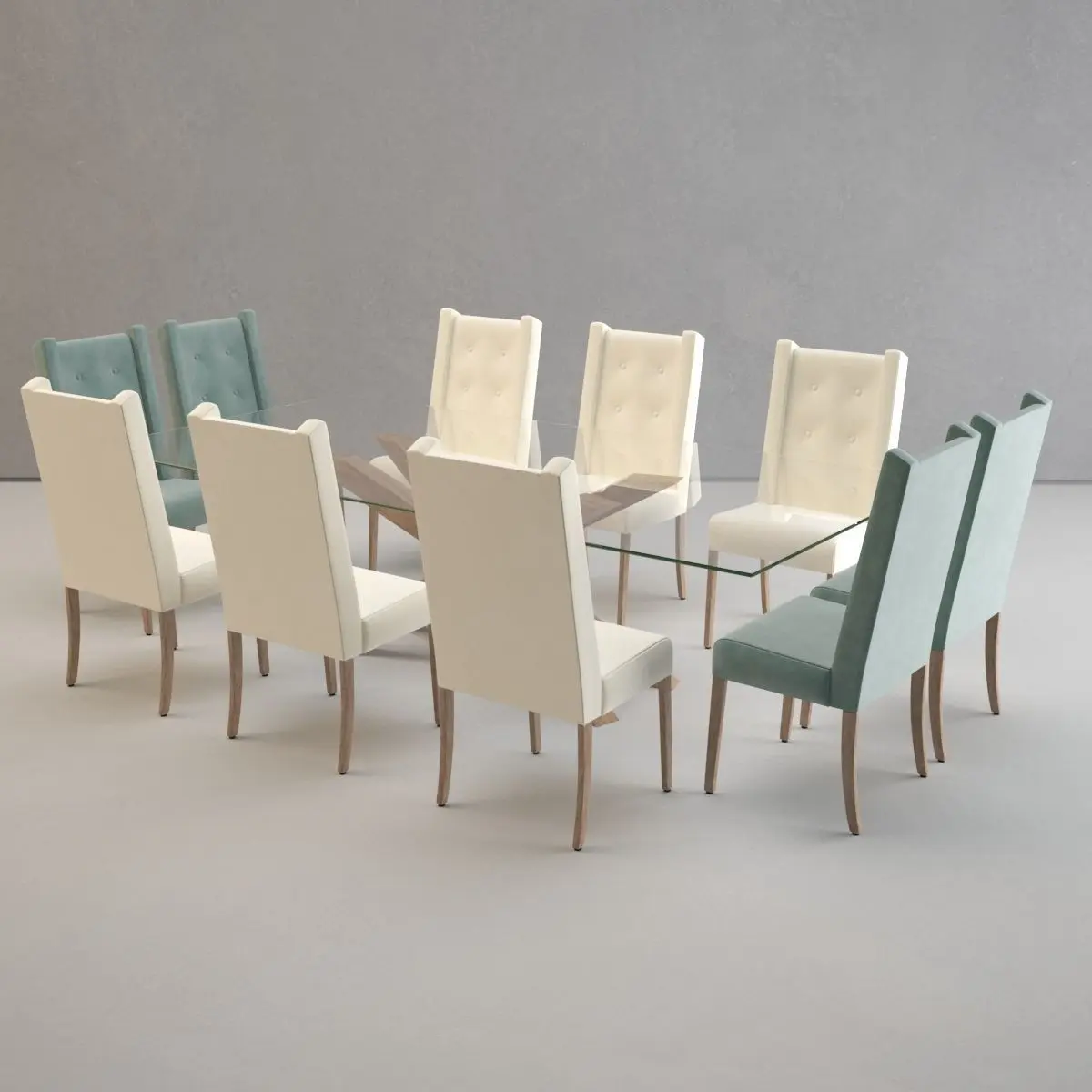 The measures are:2.40m length 1.40m width 0.75m heightthis dining room is the perfect piece for large spaces where the whole family can fit, since it has a total of 10 places.The Verona dining room has a walnut base and a 12-millimeter glass cover.The chairs are made of tufted fabric that gives style to the dining room, just like they come in two colors that are light blue and cream-colored, just like the legs are made of walnut.Echo with 3d max 2015 and vray 3.6 has its materials and textures, ready to render.