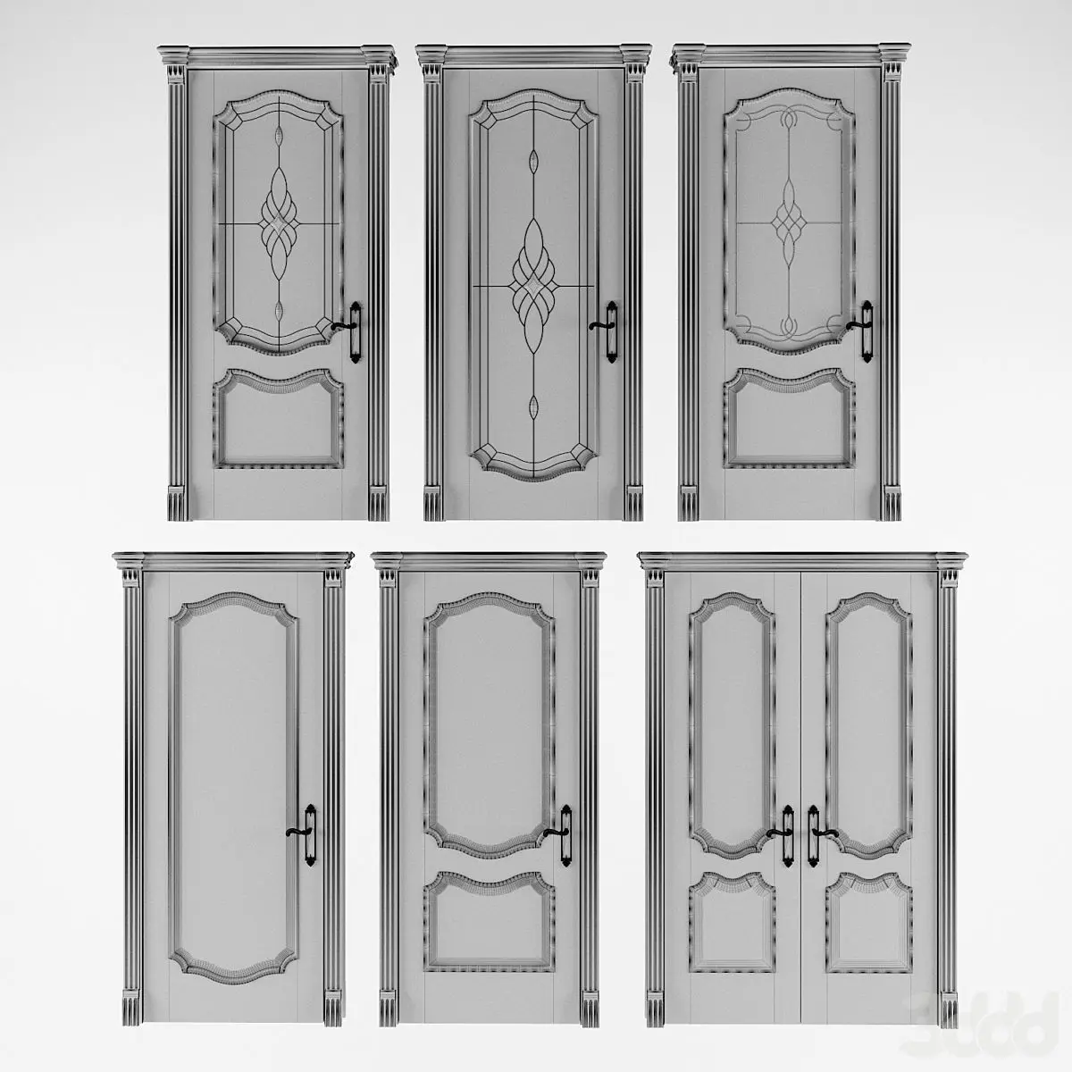 Domberg door collection in a classic style with different types of panels and sandblasted glass inserts. Single-leaf and double-leaf doors.