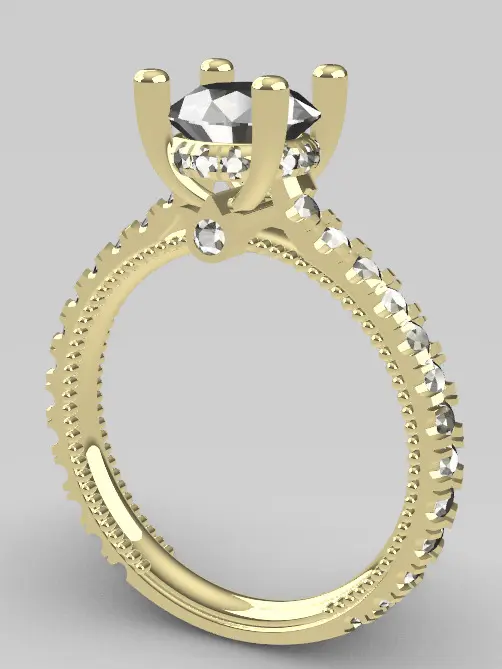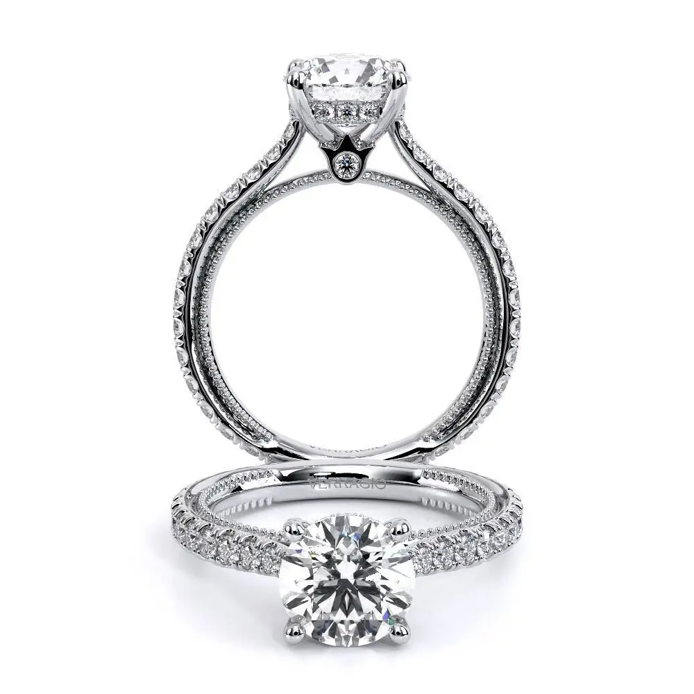 This STL file features an elegant Verragio-inspired engagement ring design with a luxurious round center stone and a pavé-style band. The ring includes intricate prong settings and detailed side stones, perfect for creating a classic yet eye-catching look.