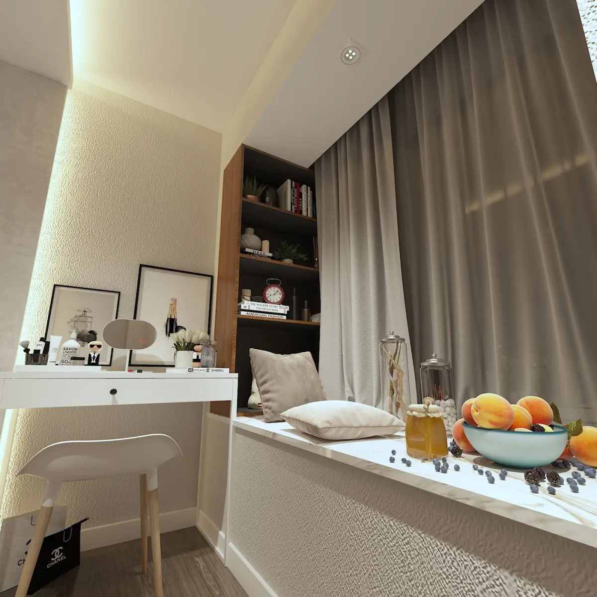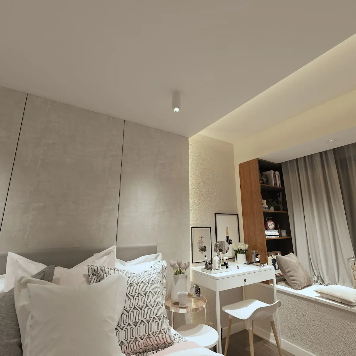 Versatile Layout: The design incorporates a dedicated workspace, making it ideal for work-from-home professionals or students.Ample Storage: The built-in wardrobe and shelves provide ample storage space for your belongings.Modern and Minimalist: The clean lines, neutral color palette, and minimalist furniture create a contemporary and sophisticated look.Cozy and Inviting: The soft textures, warm lighting, and comfortable bedding create a relaxing and cozy atmosphere.Customizable: This 3D design can be easily customized to suit your specific needs and preferences.Benefits of Purchasing This 3D Design: