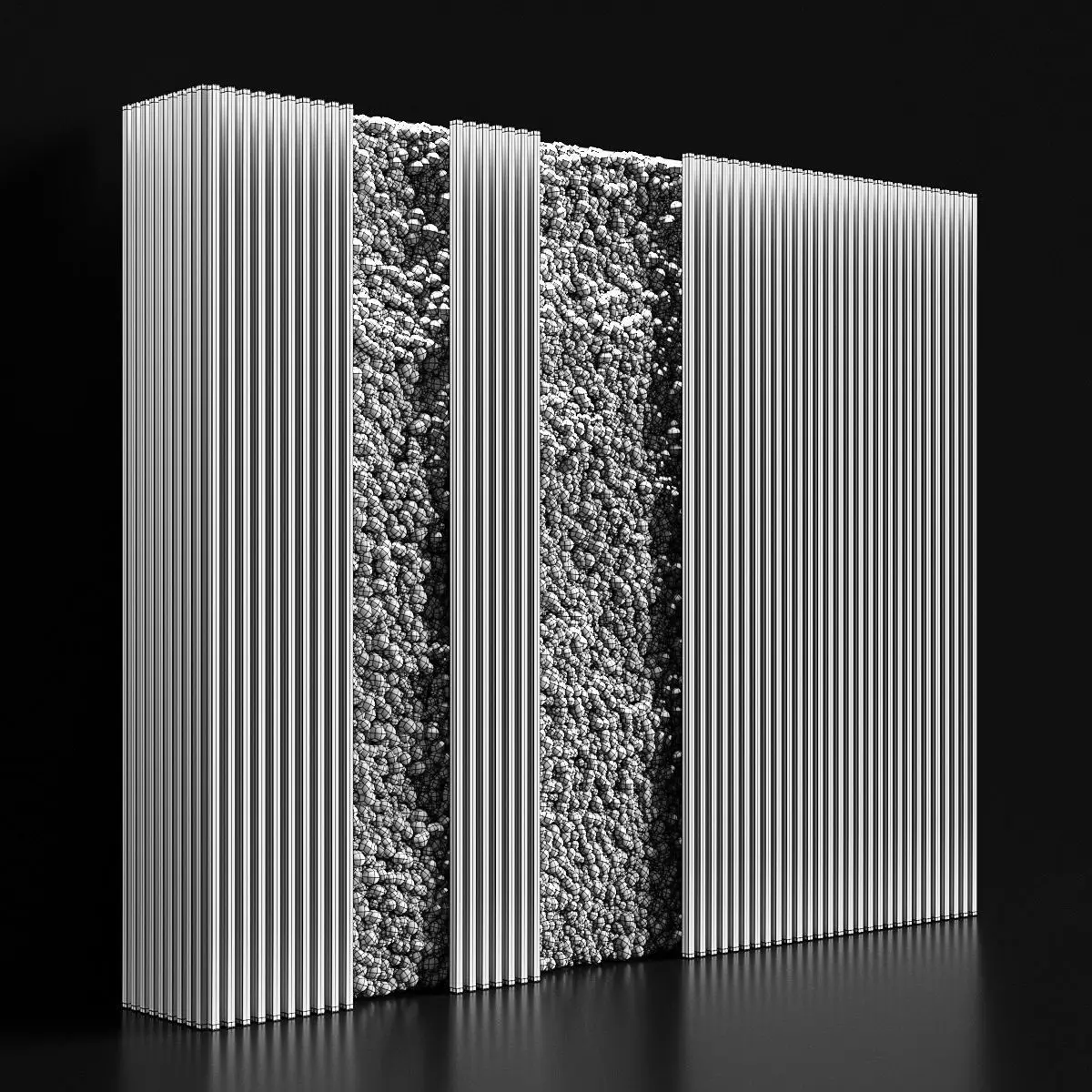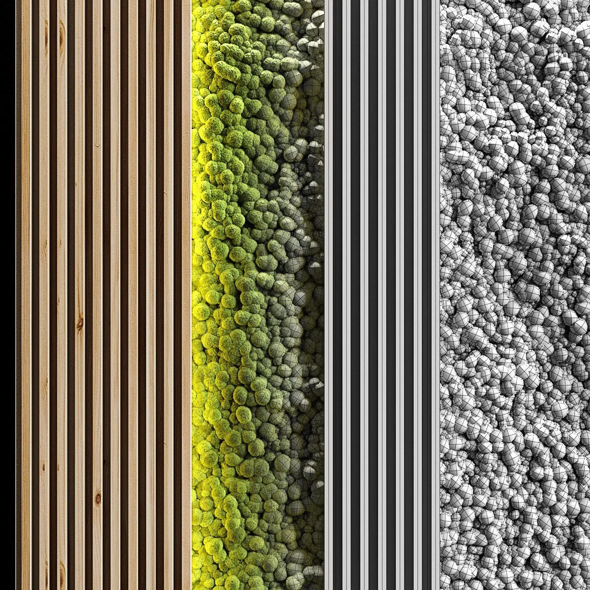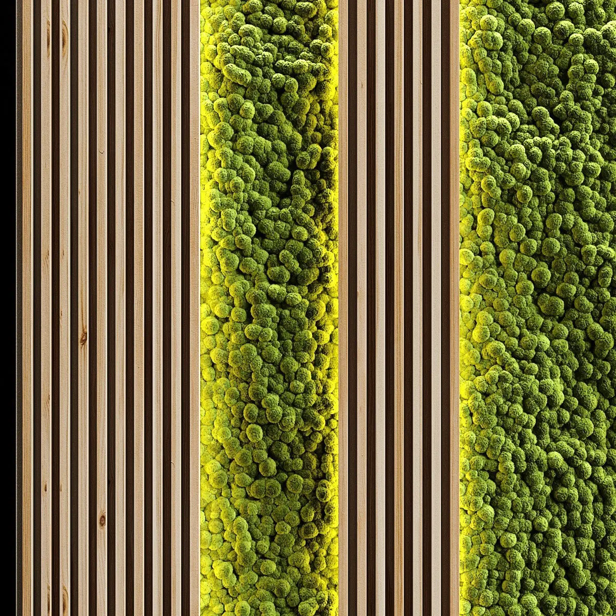 Decoration of a wall, opening or partition in the form of moss and wooden battens. It can be used both in residential and in public premises, such as a restaurant, cafe or bar. Suitable for interiors in a modern style and for interiors in a loft style.
