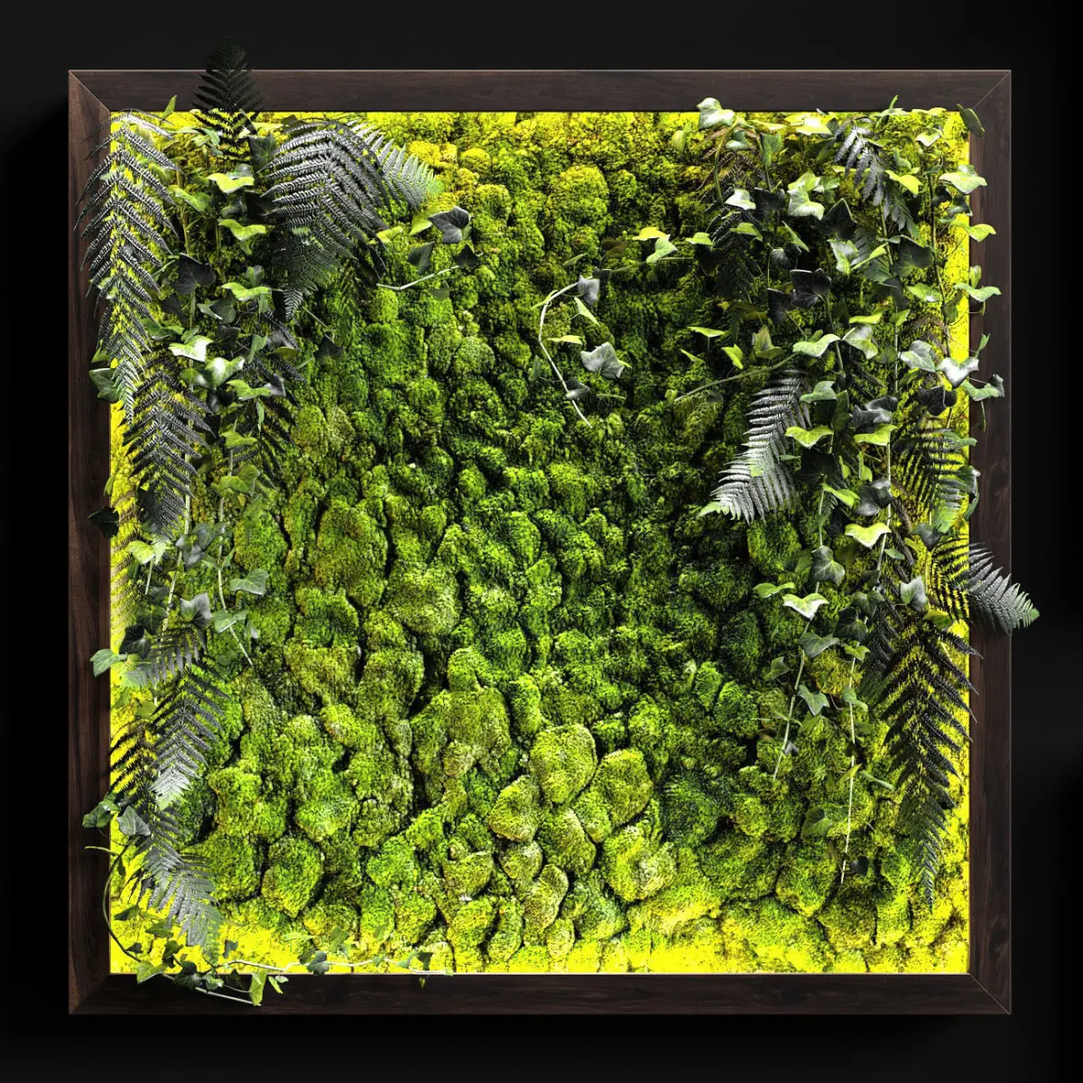 Vertical gardening in the form of three phyto walls in a wooden frame with LED lighting. Suitable for both the interior in the loft style and for the modern. It can be used as a decor over the headboard or a desktop in the nursery. It can also be used as an accent in the living room or kitchen. It can also be used in various public spaces, such as a restaurant, bar, cafe or club.