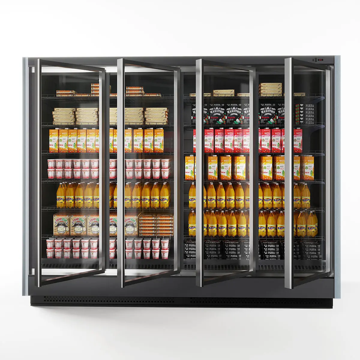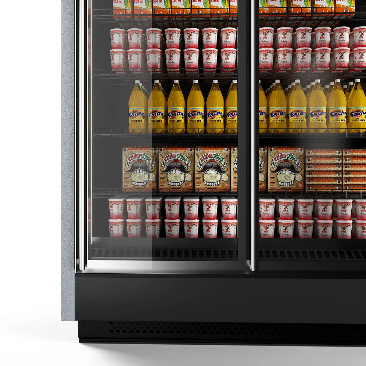 Vertical Glass Door Commercial Refrigerator in black finish.