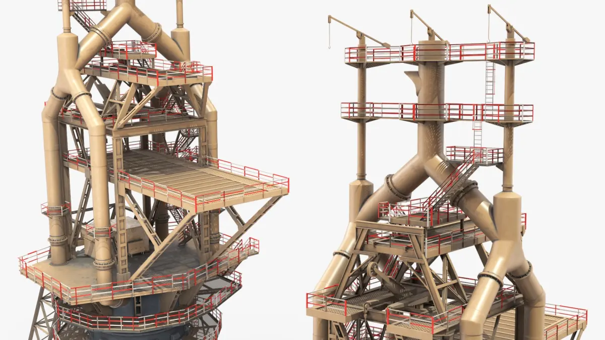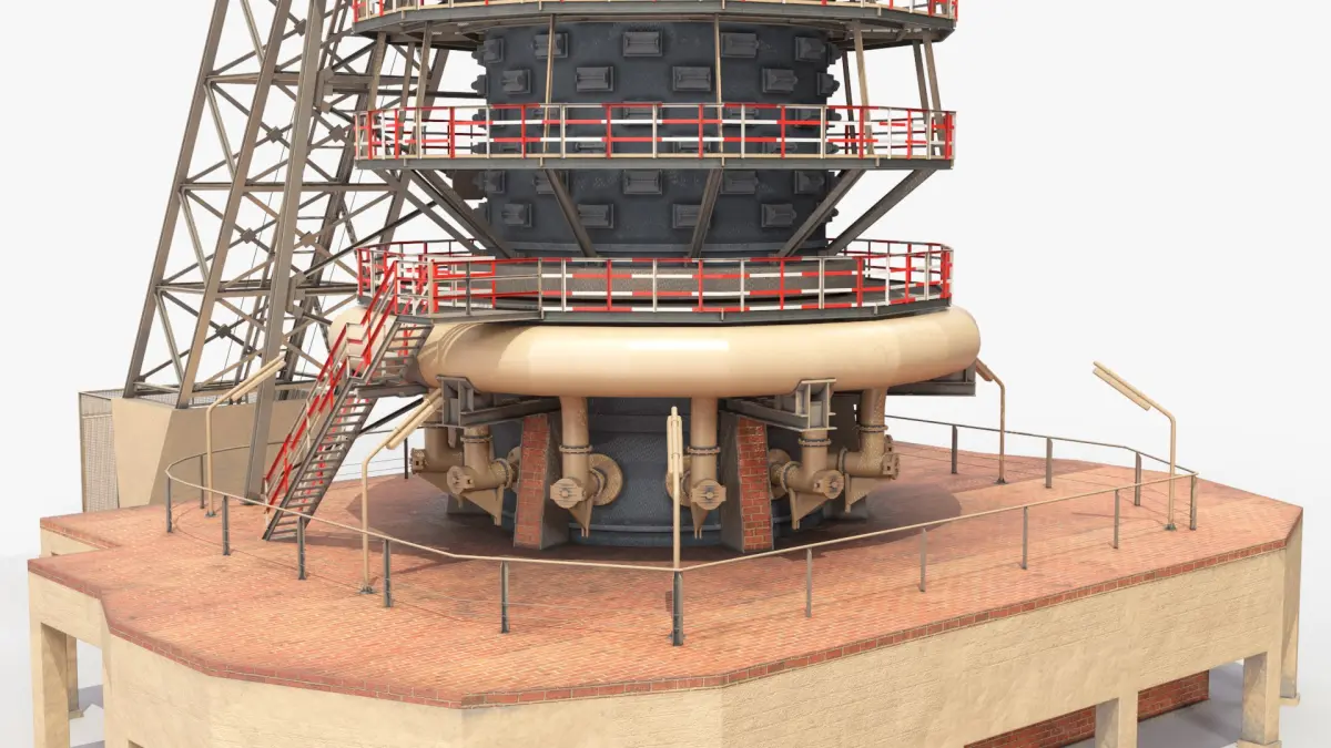 Vertical Iron Blast Furnace with Support Frame is a three-dimensional model of vertical iron blast furnace, that is a large industrial structure used for smelting iron from its ore.