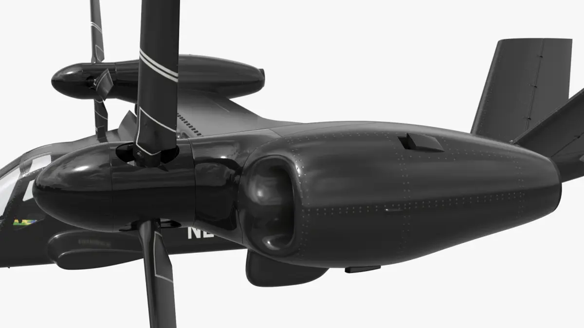The design combines the functionalities of a helicopter and an airplane, with rotors that can tilt to switch seamlessly between hover mode and forward flight. This model is characterized by sleek aerodynamics, detailed rotor mechanisms, and a realistic portrayal of the aircraft's innovative engineering.