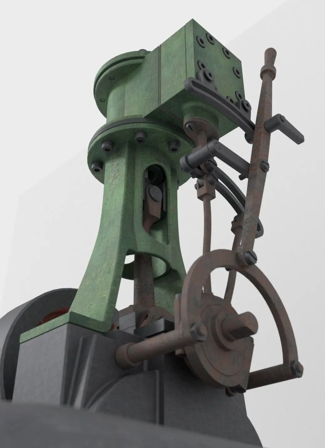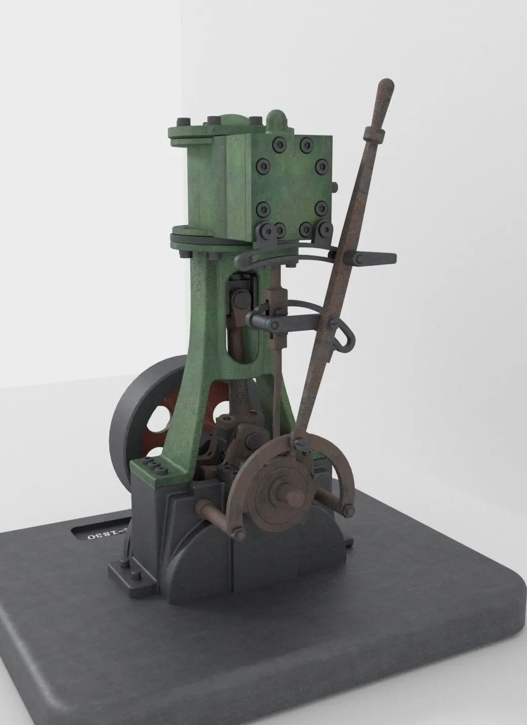 A 3D model of vertical steam engine. The model contains moving (rigged) parts to simulate a real steam engine.
