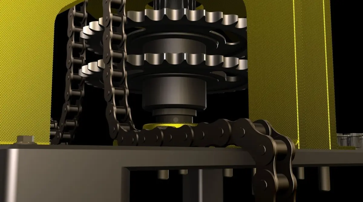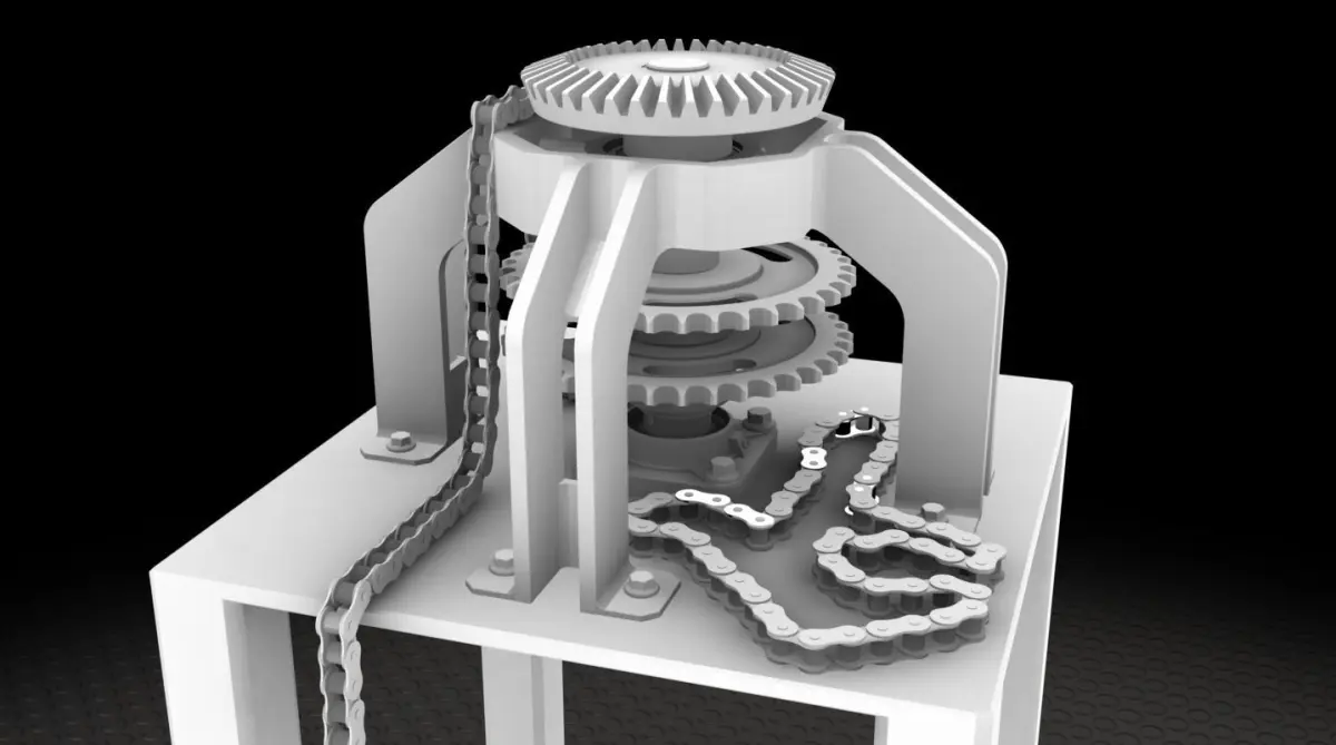 This is a simplified version of a transmission for a dual chemical mixer. Publication of the detailed model is prohibited due to signed NDA.