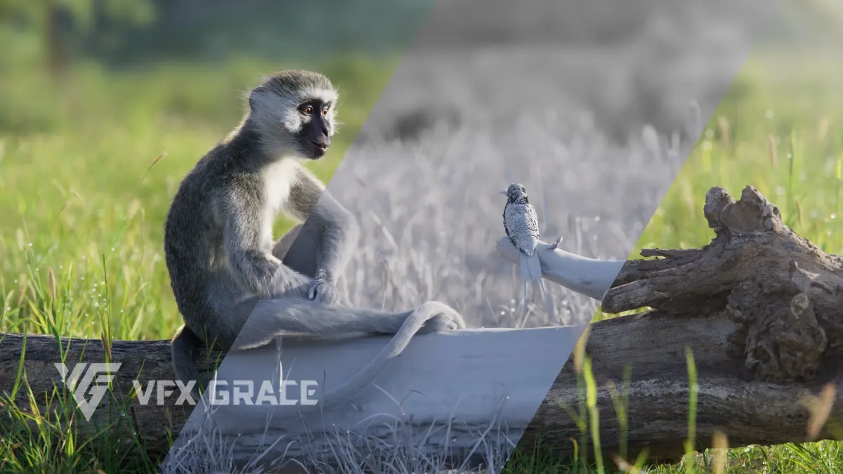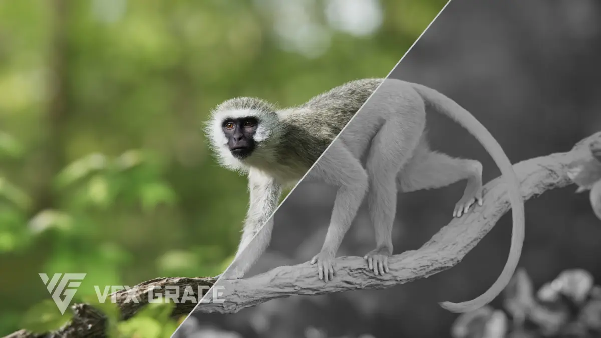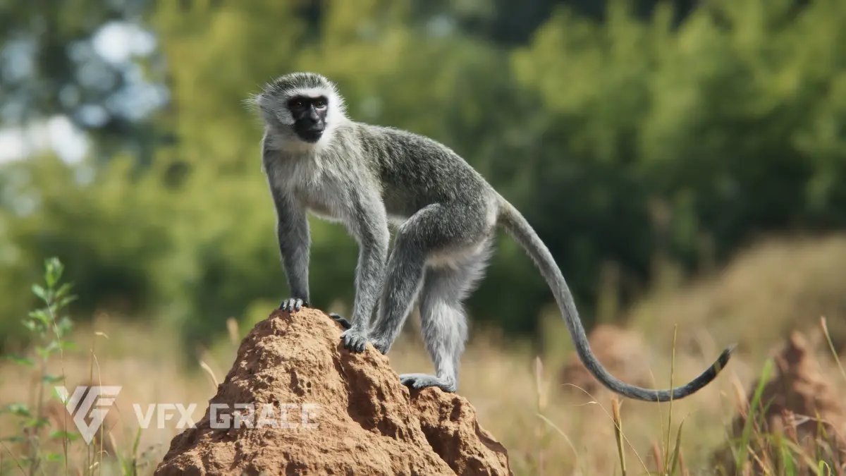 This is a high-quality vervet monkey model with 4K UDIM maps, fur, rigging, a realistic muscle structure, a realistic oral cavity and three realistic animations. A complex hair system is created in Blender with realistic effects, and a detailed facial expression controlling system is also available. This model is made with Blender and Cycles renderer at real-world scale.