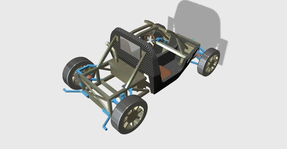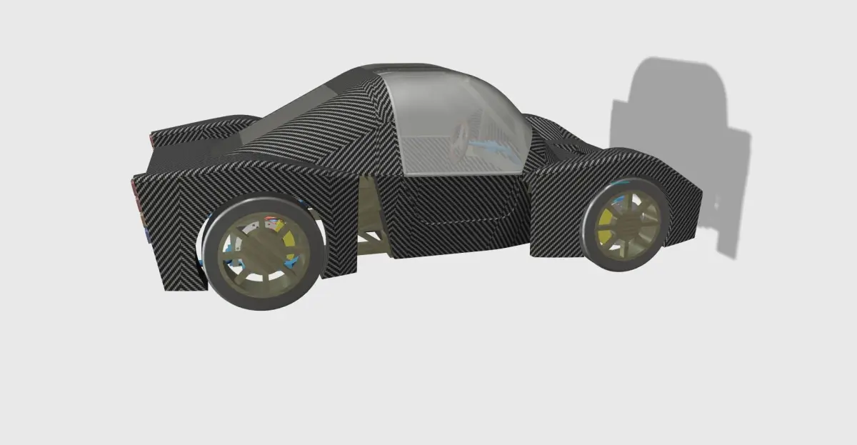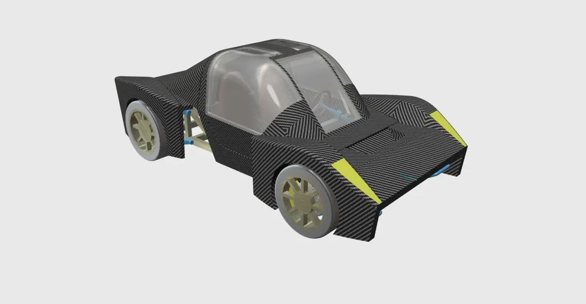 The engine is a turbocharged three-cylinder placed across in front of the rear axle together with the manual gearbox. The supporting structure consists of a central carbon one monocoque with expanded polystyrene core and front and rear aluminum subframe. The suspension consists of transverse arms. The front and back cover of the chassis also have a z core polystyrene foam. This allows it to model the wing profile on the bottom of the covers, which will be induce downforce at low air resistance compared to spoilers. Double-sided coating of these parts with the foam core will also make it possible to use very thin layers of laminate and thus reduce weight while maintaining sufficient stiffness. Dimensions... lenght 345cm, width 173cm, hight 124 whellbase 225cm, weight cca 450 - 550kg, engine power cca 100kW, gearbox manual 6 gear. Model size 1:10.