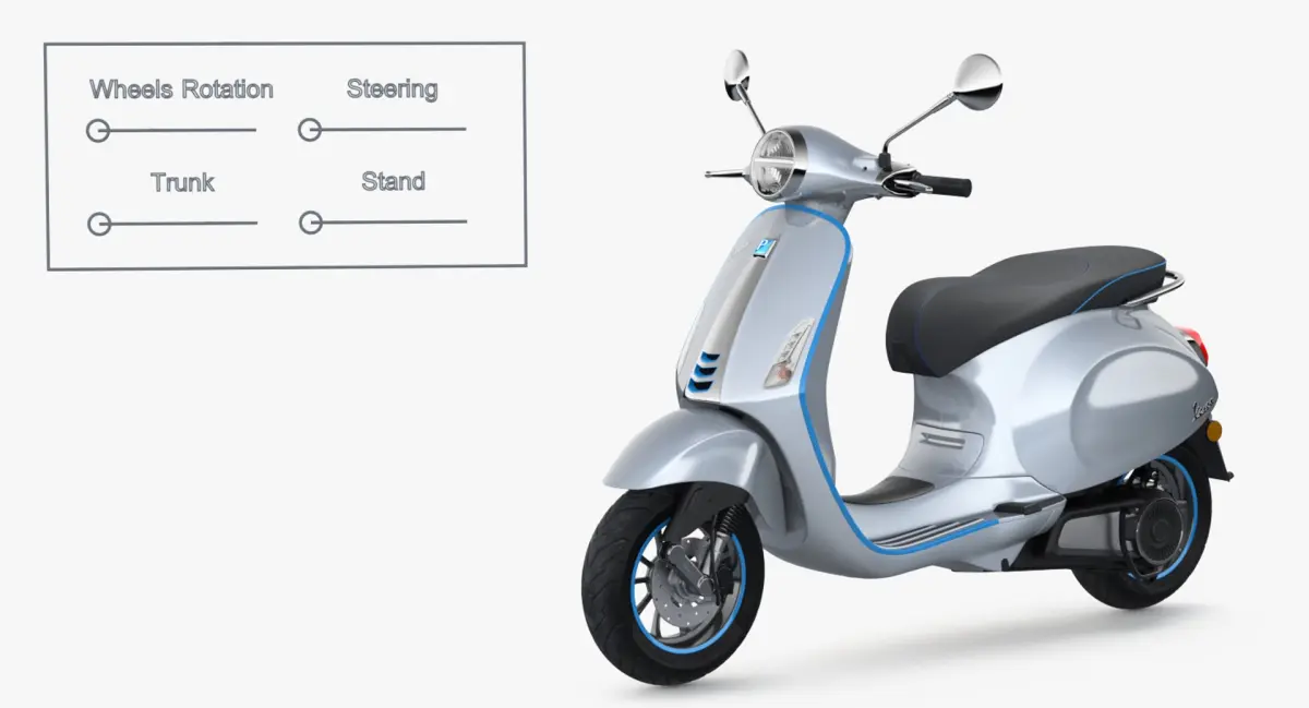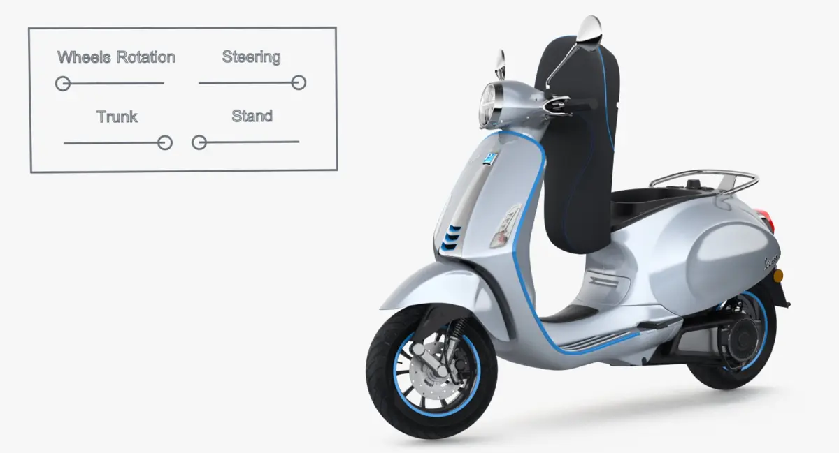 Vespa Elettrica 2019 Rigged Scooter is fully rigged and is ready to be animated. You can easily position it the way you need or animate it the way your project requires using helpers in 3D Studio Max. See the turntable to get an idea of how rigging works.