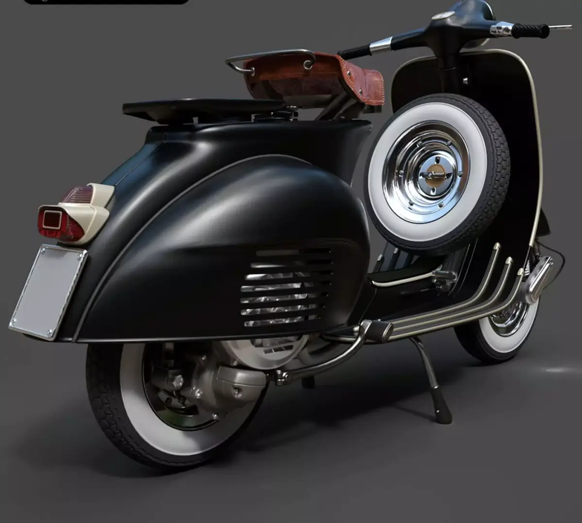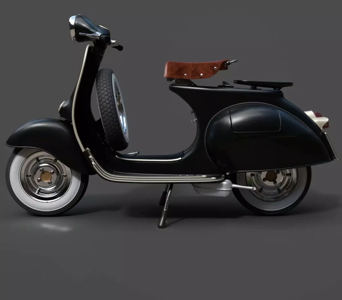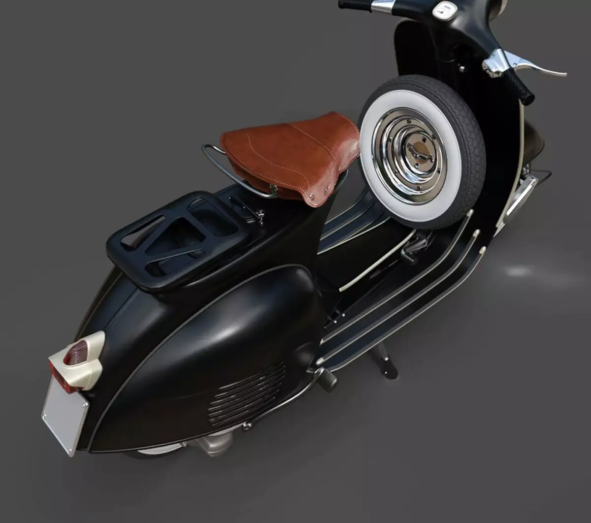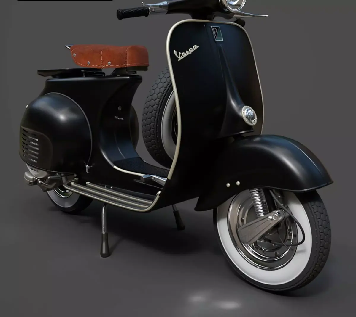 A premium, hyper-realistic 3D model of the Vespa Standard. This asset is a faithful recreation of the timeless Italian scooter, featuring the signature flowing curves, distinctive engine cover, and integrated floorboard strips. Every surface, from the flared leg shield to the classic solo saddle and rear luggage rack, has been modeled with high-fidelity accuracy for professional CGI and lifestyle visualization.