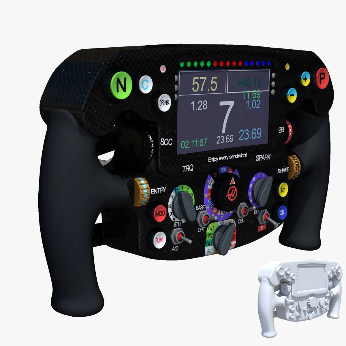 This is a 3D low poly model ,it was designed to provide a high definition in a low poly. Standard low-poly mesh with specific poly count. It`s the most accurate and realistic of the market. This is a recreation of a F1 steering wheel car model,it can suffer modification over the season. The model is completely ready for use visualization in maya. For low poly model simply press 1 and for the high resolution press 3. In Cinema4d go to function menu and subdivide. In 3dmax meshsmooth In the low poly: Poly count :9726Vertex count : 10217In the high poly: Poly count : 155632Vertex count : 157465Textures included. Each texture is in jpg format and have a 4K texture resolution for high quality It has color textures and specular textures The files are obj, fbx, mb ,c4d and 3DS. Because of different Disk topology at different computers it might be required to change the textures path at the destination computer. The 3D model was created on real car base. It's created accurately, in real units of measurement, qualitatively and maximally close to the original. Please feel free to contact us for any query or if you need further assistance, we will be happy to assist you.