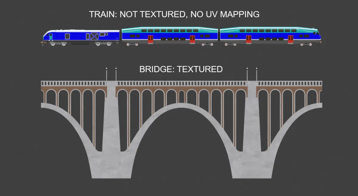 - Train model is NOT TEXTURED (NO UV MAPPING).
