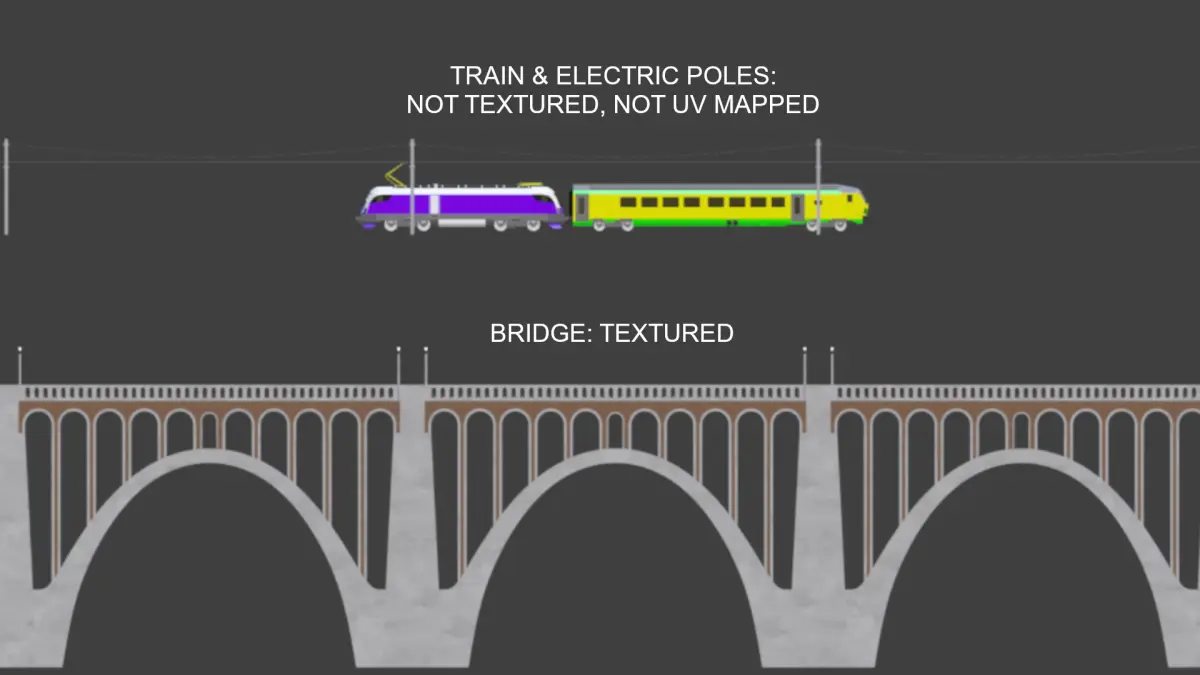- Train and electric poles are NOT TEXTURED (NO UV MAPPING).