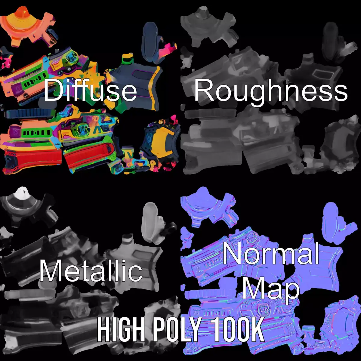 This vibrant blaster model pack is designed with a colorful and modern aesthetic, making it perfect for futuristic games, animations, and VR experiences. Each model has 3 levels of detail: low-poly (1000 triangles for mobile), middle-poly (10,000 triangles for environment), and high-poly (100,000 triangles), which allows for the use of this model in production rendering (such as 3ds Max, Maya, Cinema4D, Blender, Vray/Corona/Cycles and all others), game engines (Unity and Unreal compatible), and interactive presentations, providing a choice of detail based on the LOD System principle. The blaster's textures are PBR, Diffuse, NormalMap, and reflection/roughness/metallic, which are suitable for any modern rendering engine. All models accurately unwrapped and have no overlapping UVs. The model is ideal for creating dynamic battle scenes or as a prop in sci-fi environments. All textures are 4096*4096 in size. If you like this model, please leave a comment and like it.